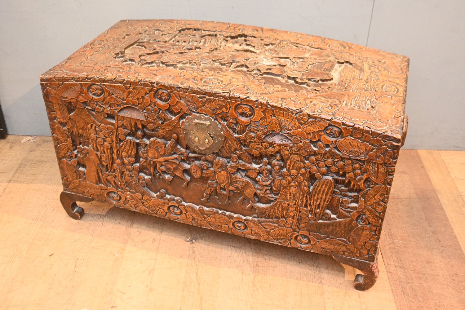 A CHINESE CARVED CAMPHORWOOD CHEST (62H X 106W X 51D CM) (PLEASE NOTE THIS HEAVY ITEM MUST BE REMOVED BY CARRIERS AT THE CUSTOMER'S EXPENSE. LEONARD JOEL STAFF CANNOT ASSIST CARRYING THIS ITEM) (LARGE ITEM)