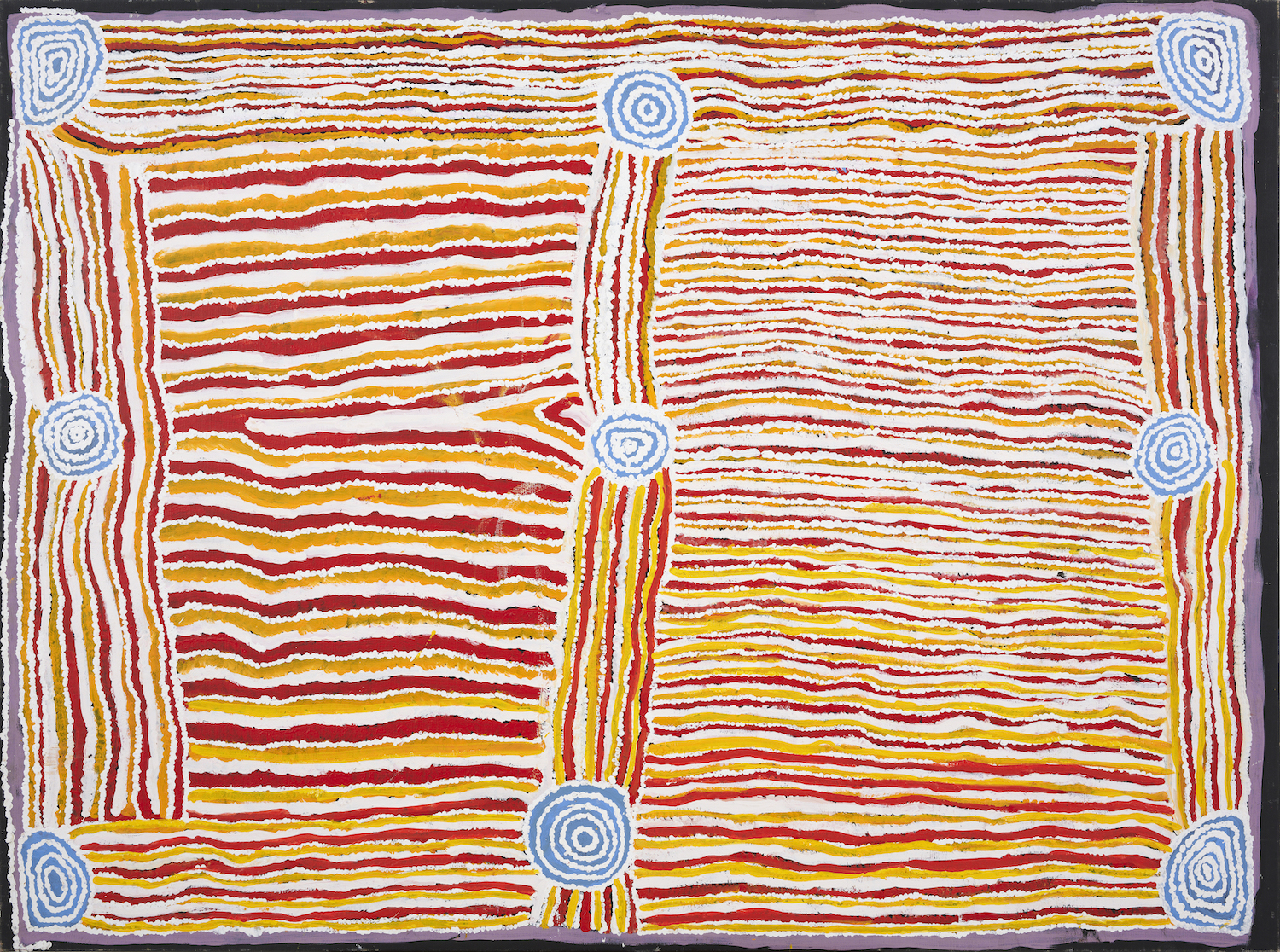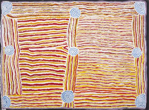 "Reflecting the strong relationships between the artist, her land and culture, Karrika's work brings together contemporary painting techniques and media with ancient visual language and tjukurrpa (dreaming stories). 'My country is Pulpul where there is a big rockhole. Auntie heard all of the people coming chasing a malu, but it was not really a malu, it was a man dressed up as a malu. When she heard them coming Auntie thumped on the ground so that they could all get to the water through a tunnel under the ground. When they went through the tunnel Auntie blocked the way so they could not get out. Men, women and children. They are still there. When I was a child we used to go on through the tunnel to get water with a firebrand to frighten them away.' Karrika is Chair of Ngaanyatjarra Media. As well as filming documentaries of her culture and painting, she continues to practice traditional cultural business, law and medicine and collect bushfoods."