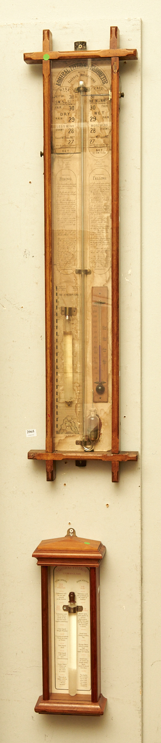 A HARDWOOD-CASED ADMIRAL FITZROY BAROMETER AND AN ADMIRAL FITZROY STORM GLASS H.105CM (TALLEST), LEONARD JOEL LOCAL DELIVERY: LARGE