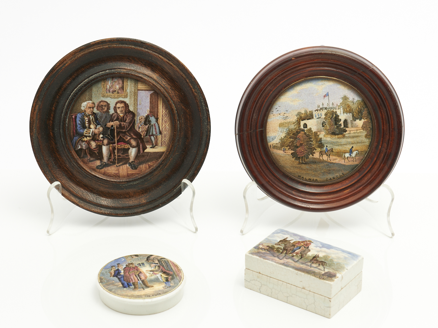 FOUR PIECES OF ANTIQUE PORCELAIN TRANSFER WARE INCLUDING TWO FRAMED PLAQUES AND A BOX DIA.16CM (LARGEST) (A/F, BOX REPAIRED), LEONARD JOEL LOCAL DELIVERY: SMALL