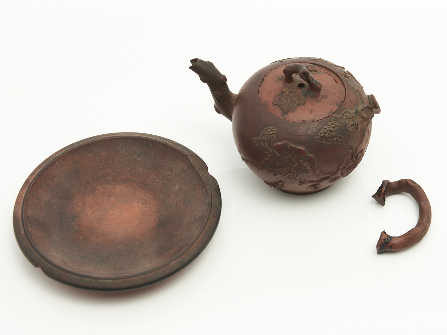 AN 18TH CENTURY TERRACOTTA TEAPOT AND UNDERPLATE, POSSIBLY YIXING OR MEISSEN (A/F) H.9.5CM, LEONARD JOEL LOCAL DELIVERY: SMALL