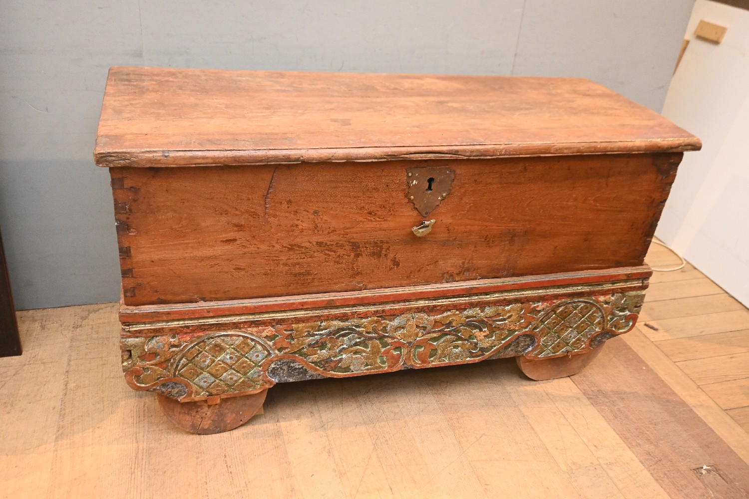A 19TH CENTURY INDIAN HARDWOOD CHEST ON WHEELS (A/F) (76H X 137W X 54D CM) (PLEASE NOTE THIS HEAVY ITEM MUST BE REMOVED BY CARRIERS AT THE CUSTOMER'S EXPENSE. LEONARD JOEL STAFF CANNOT ASSIST CARRYING THIS ITEM) (LARGE ITEM)
