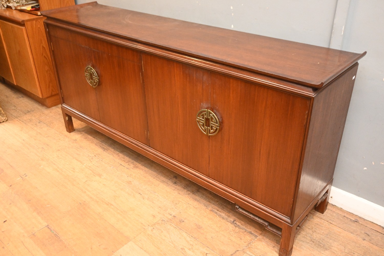 A LATE 1960S / EARLY 1970S HARDWOOD SIDEBOARD IN CHINESE MANNER BY DECRO (A/F) (88H X 166W X 50D CM) (PLEASE NOTE THIS HEAVY ITEM MUST BE REMOVED BY CARRIERS AT THE CUSTOMER'S EXPENSE. LEONARD JOEL STAFF CANNOT ASSIST CARRYING THIS ITEM) (LARGE ITEM)