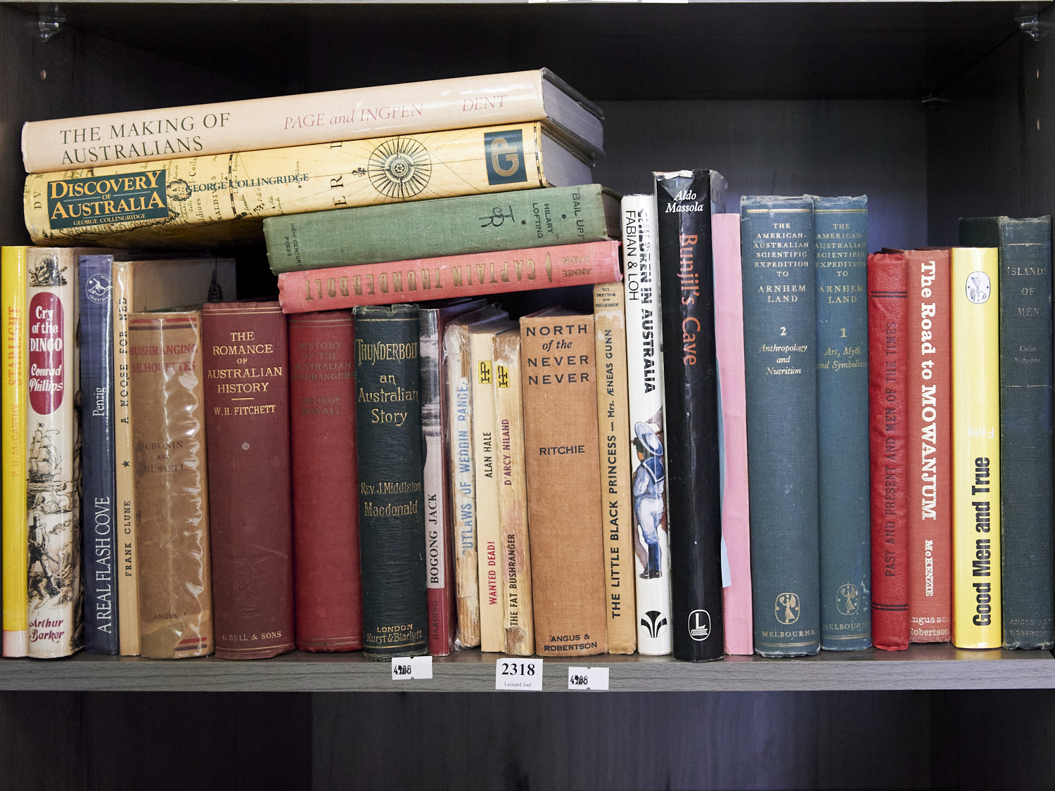 A SHELF OF BOOKS CONCERNING AUSTRALIAN COLONIAL HISTORY AND BUSHRANGERS INCLUDING CAPTAIN THUNDERBOLT, BAIL UP, BUSHRANGING SILHOUETTES, AND VOLUMES I & II OF THE AMERICAN-AUSTRALIAN SCIENTIFIC EXPEDITION TO ARNEM LAND, LEONARD JOEL LOCAL DELIVERY: MEDIUM