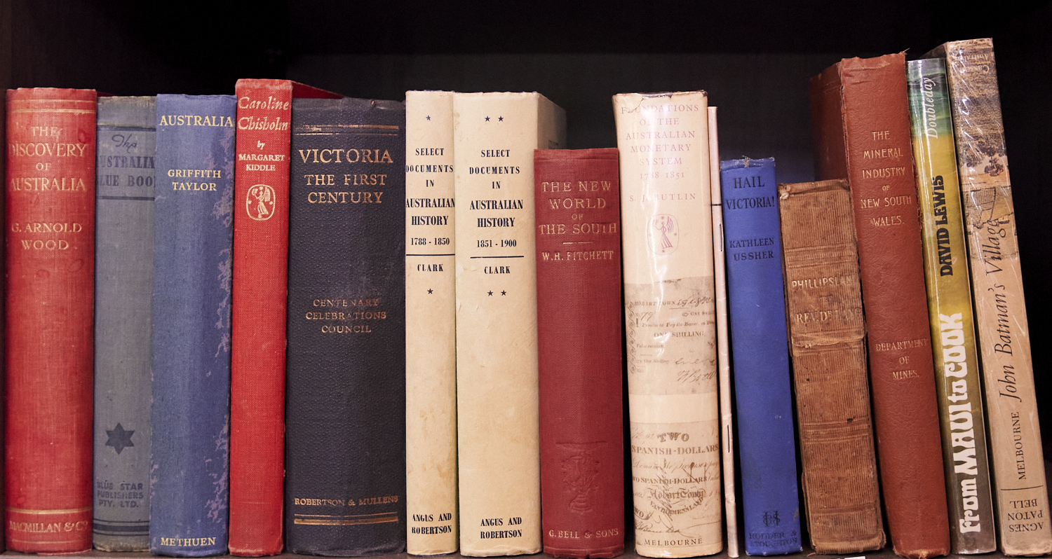 A SHELF OF BOOKS CONCERNING AUSTRALIAN COLONIAL HISTORY INCLUDING THE DISCOVERY OF AUSTRALIA, THE NEW WORLD OF THE SOUTH, AND VICTORIA THE FIRST CENTURY, LEONARD JOEL LOCAL DELIVERY: SMALL