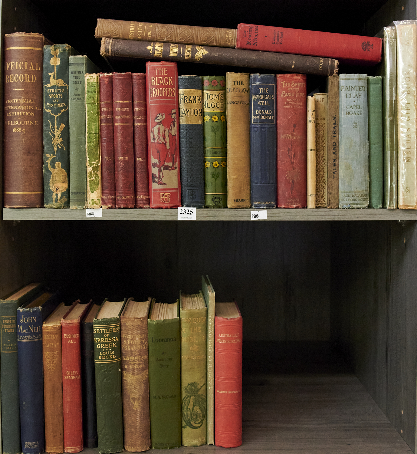 A SHELF AND A HALF OF BOOKS CONCERNING AUSTRALIAN HISTORY INCLUDING MELBA'S GIFT BOOK, THE SPIRIT OF THE BUSH FIRE, OFFICIAL RECORD/CENTENNIAL INTERNATIONAL EXHIBITION/MELBOURNE 1888-9, AND SETTLERS OF KAROSSA CREEK LEONARD JOEL LOCAL DELIVERY: SMALL