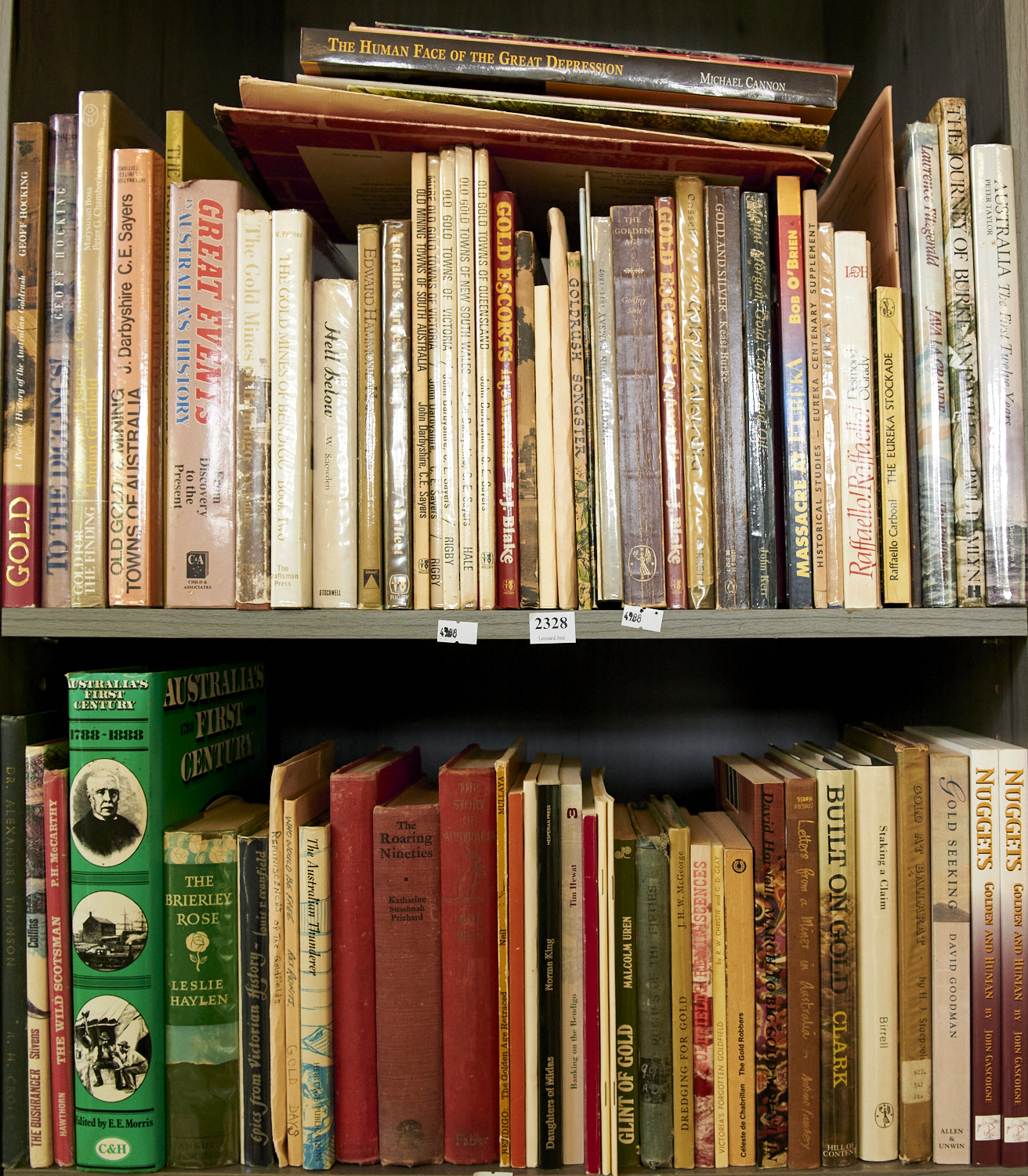 TWO SHELVES OF BOOKS CONCERNING AUSTRALIAN HISTORY AND GOLDMINING, LEONARD JOEL LOCAL DELIVERY: LARGE