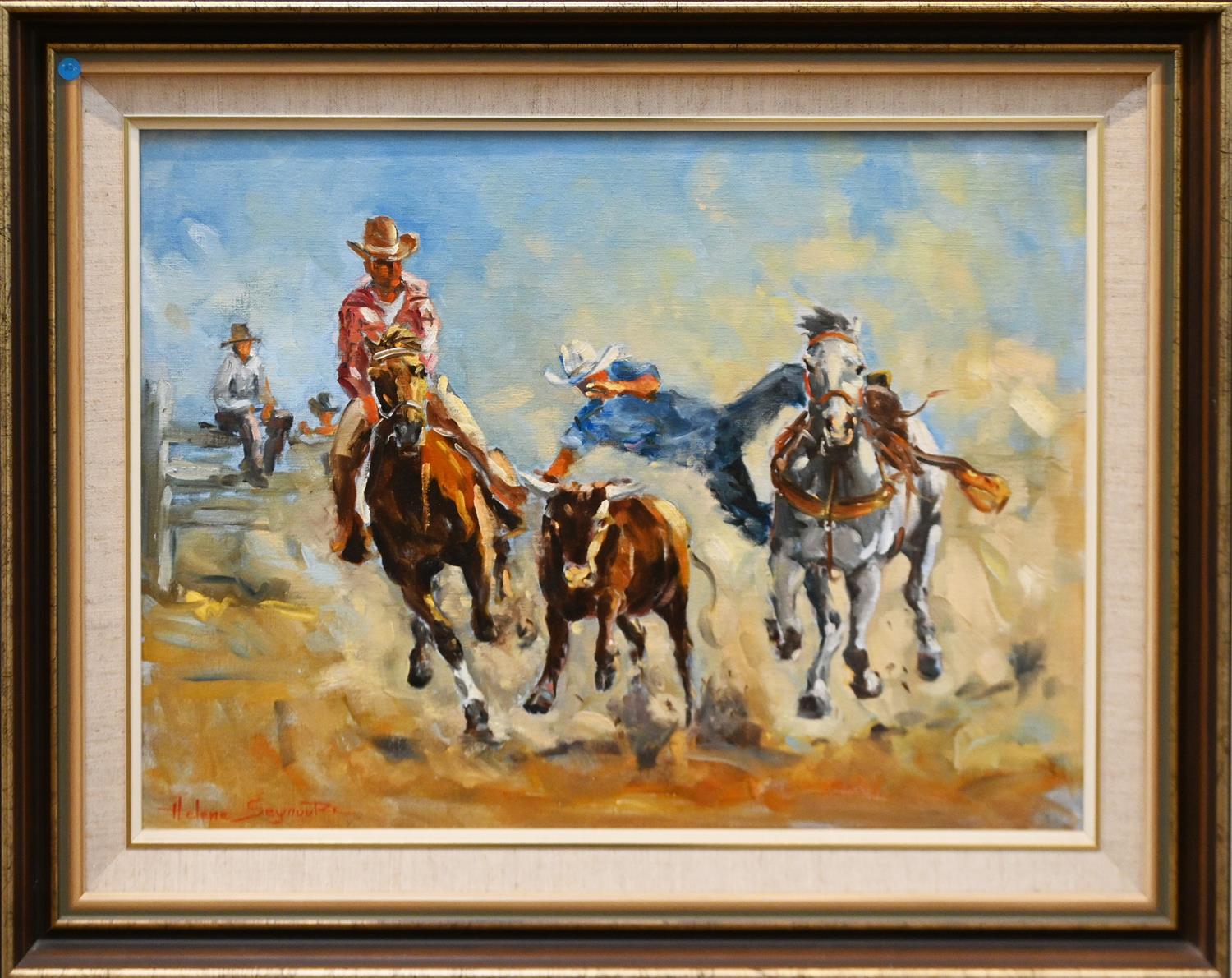 HELENE SEYMOUR, BULLDOGGING, OIL ON MASONITE, SIGNED LOWER LEFT, 44 X 59.5CM, FRAME SIZE: 61 X 76CM