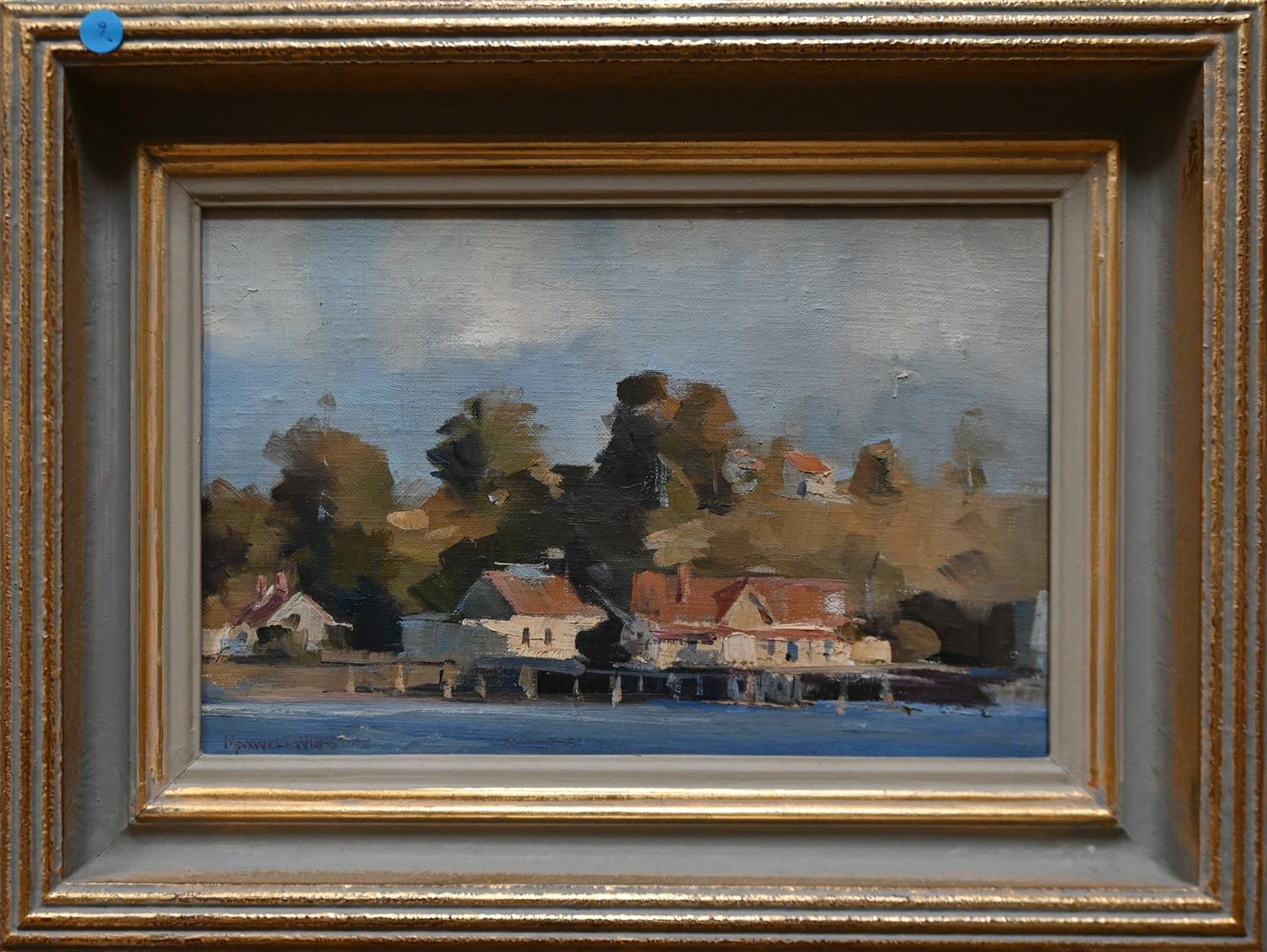 MAXWELL WILKS, THE PIER AT STRAHAN, TASMANIA 1974, OIL ON CANVAS, SIGNED AND DATED LOWER LEFT, 18.5 X 28.5CM, FRAME SIZE: 32 X 42.5CM