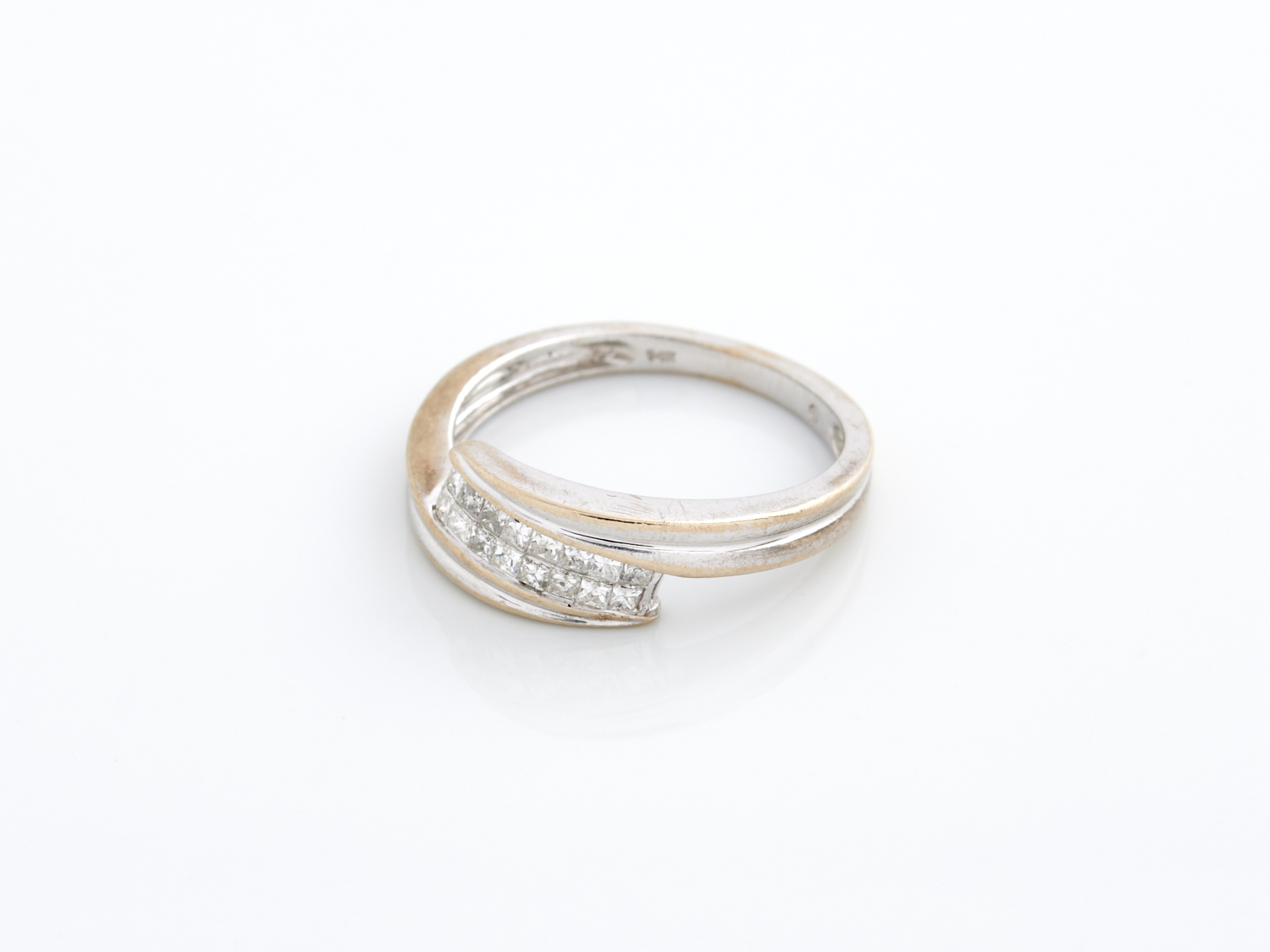 A DIAMOND BAND IN 14CT WHITE GOLD, SIZE O, 2.8GMS