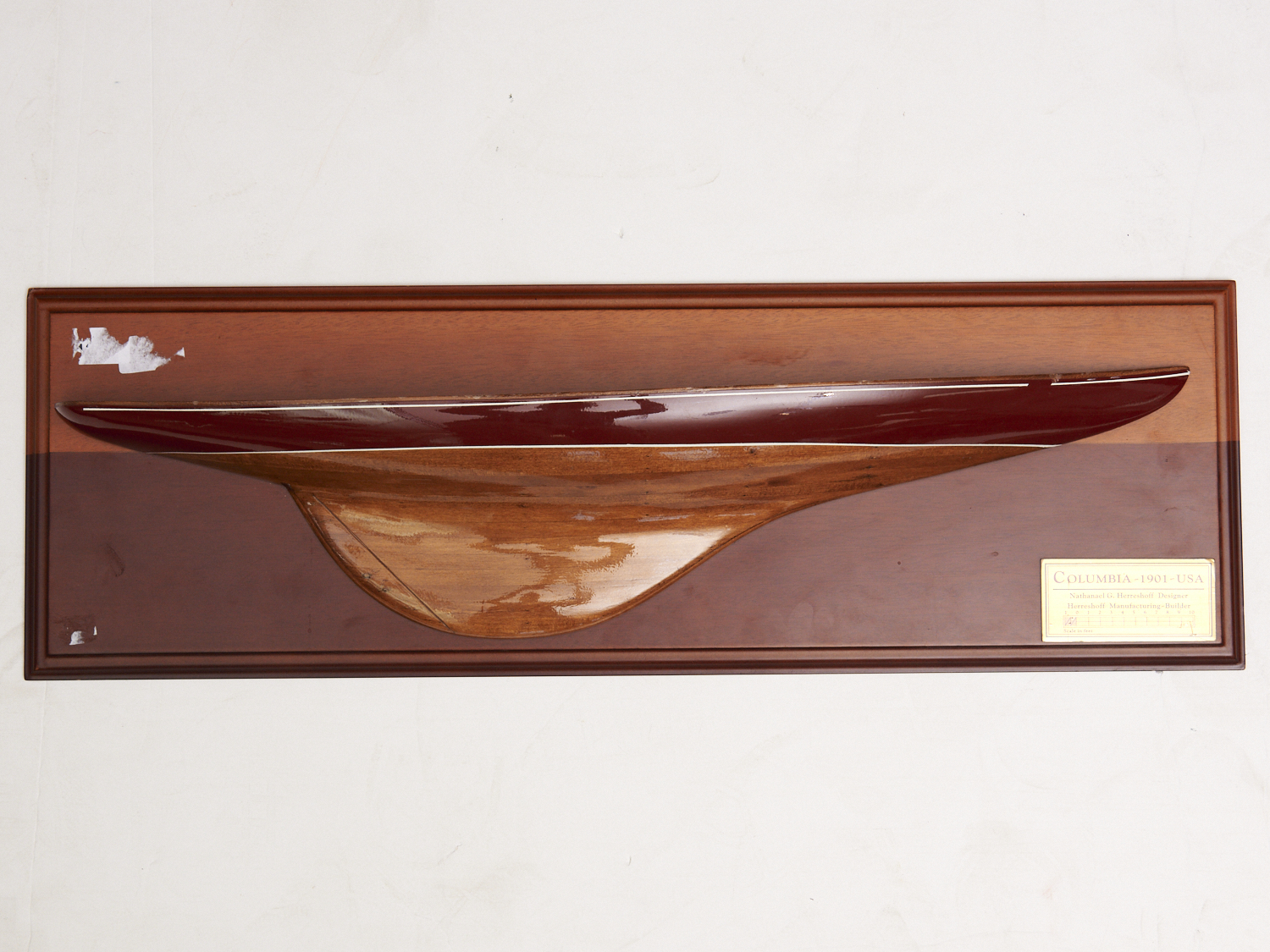 A HALF HULL MODEL OF A BOAT MOUNTED FOR HANGING L.71CM, LEONARD JOEL DELIVERY SIZE: SMALL