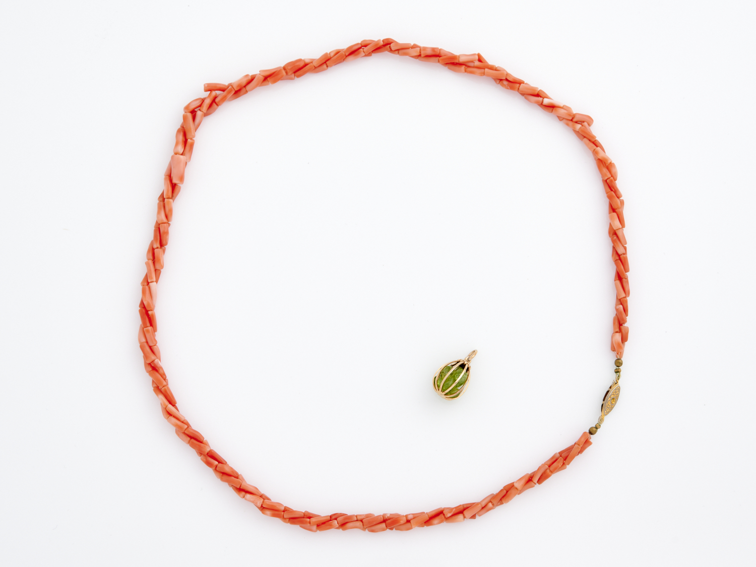 A TRIPLE STRAND CORAL NECKLACE TO A CLASP IN GOLD PLATE, TOGETHER WITH A PERIDOT PENDANT