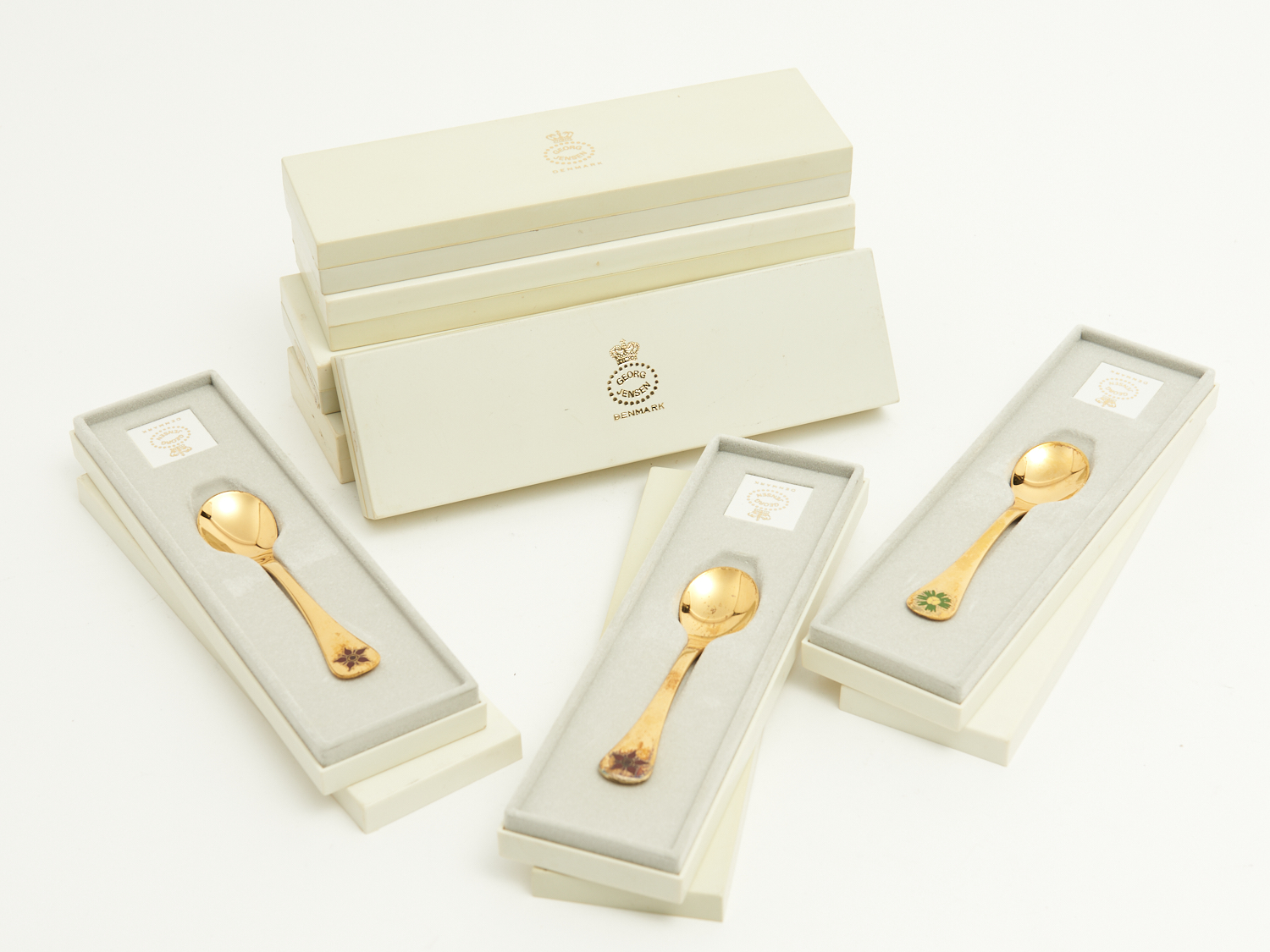 A GROUP OF SEVEN SMALL STERLING SILVER GILT AND ENAMEL GEORG JENSEN YEAR SPOONS WITH A SMALL MATCHING SPOON AND FORK SET L.11CM (SPOON) 164G, LEONARD JOEL DELIVERY SIZE: SMALL