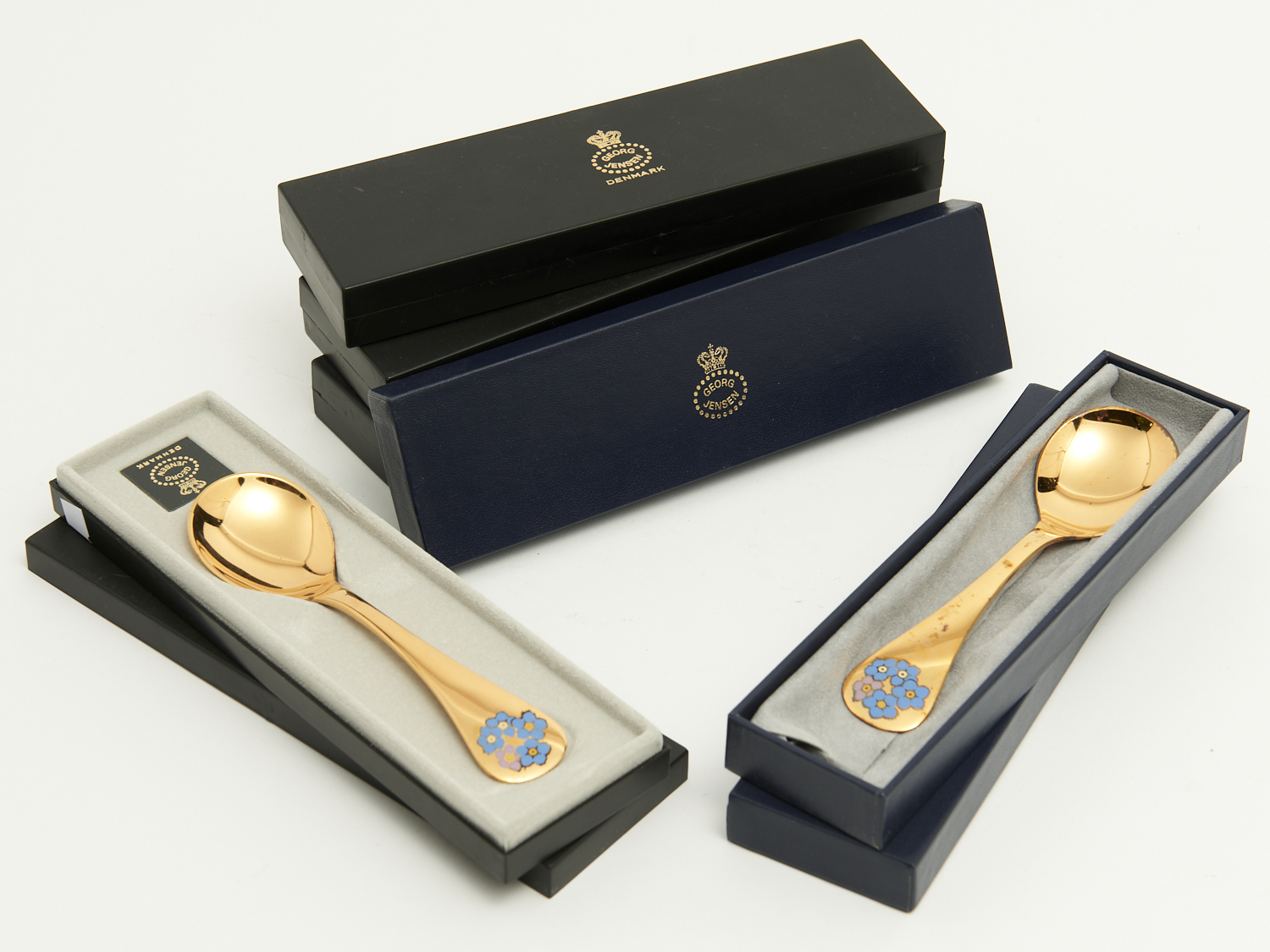 A GROUP OF SIX LARGE STERLING SILVER GILT AND ENAMEL GEORG JENSEN YEAR SPOONS L.15CM 252G, LEONARD JOEL DELIVERY SIZE: SMALL