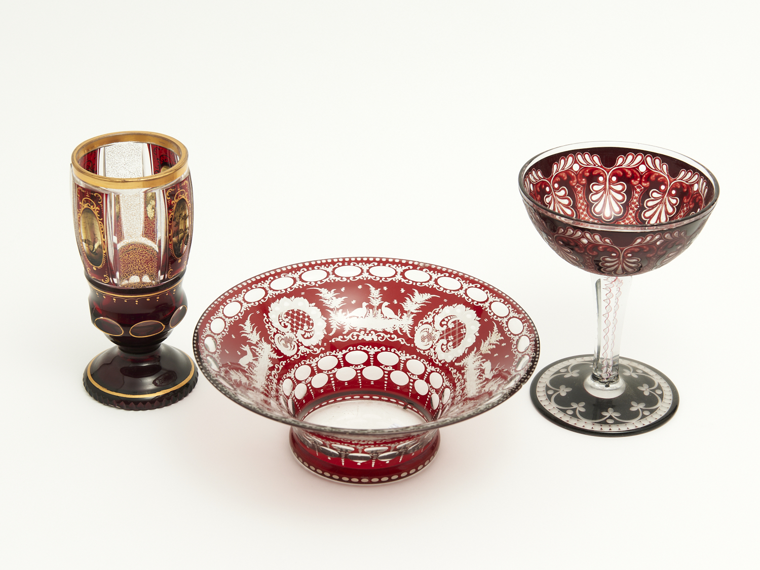 A RUBY BOHEMIAN GLASS HUMPEN, BOWL AND COMPORT WITH COTTON TWIST STEM H.18CM (TALLEST) (A/F, CHIP TO BOWL), LEONARD JOEL DELIVERY SIZE: MEDIUM