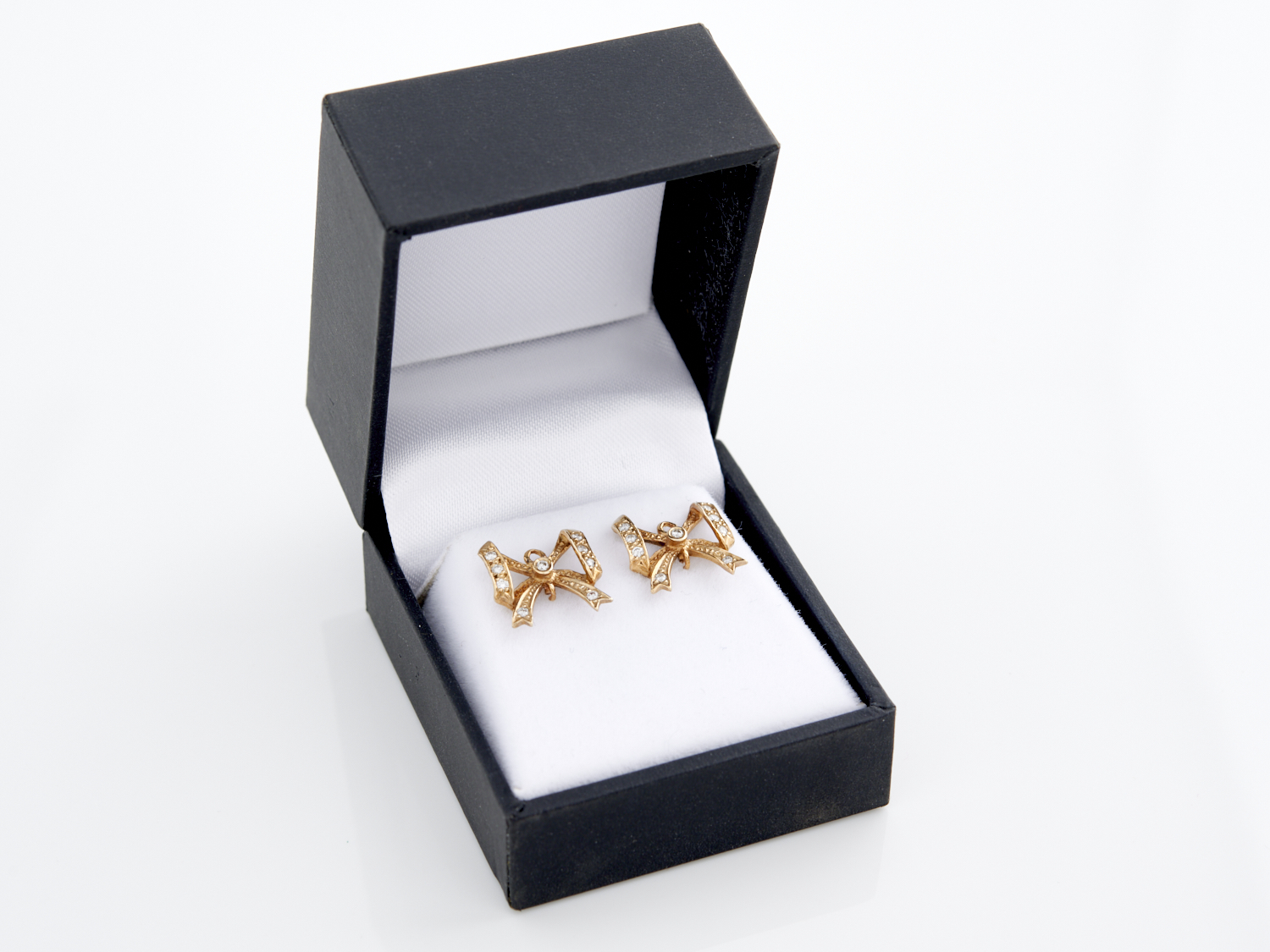 A PAIR OF DIAMOND OF DIAMOND ACCENTED BOW EARRINGS IN 9CT GOLD, TO POST AND BUTTERFLY FITTINGS