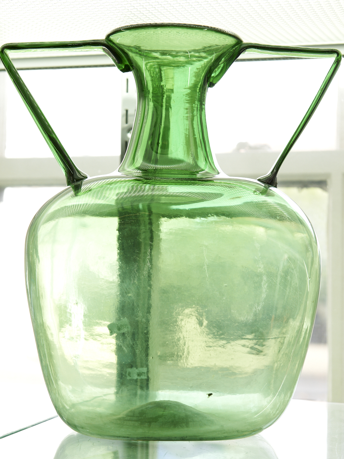 A GREEN BLOWN GLASS AMPHORA H.39CM, LEONARD JOEL LOCAL DELIVERY: MEDIUM