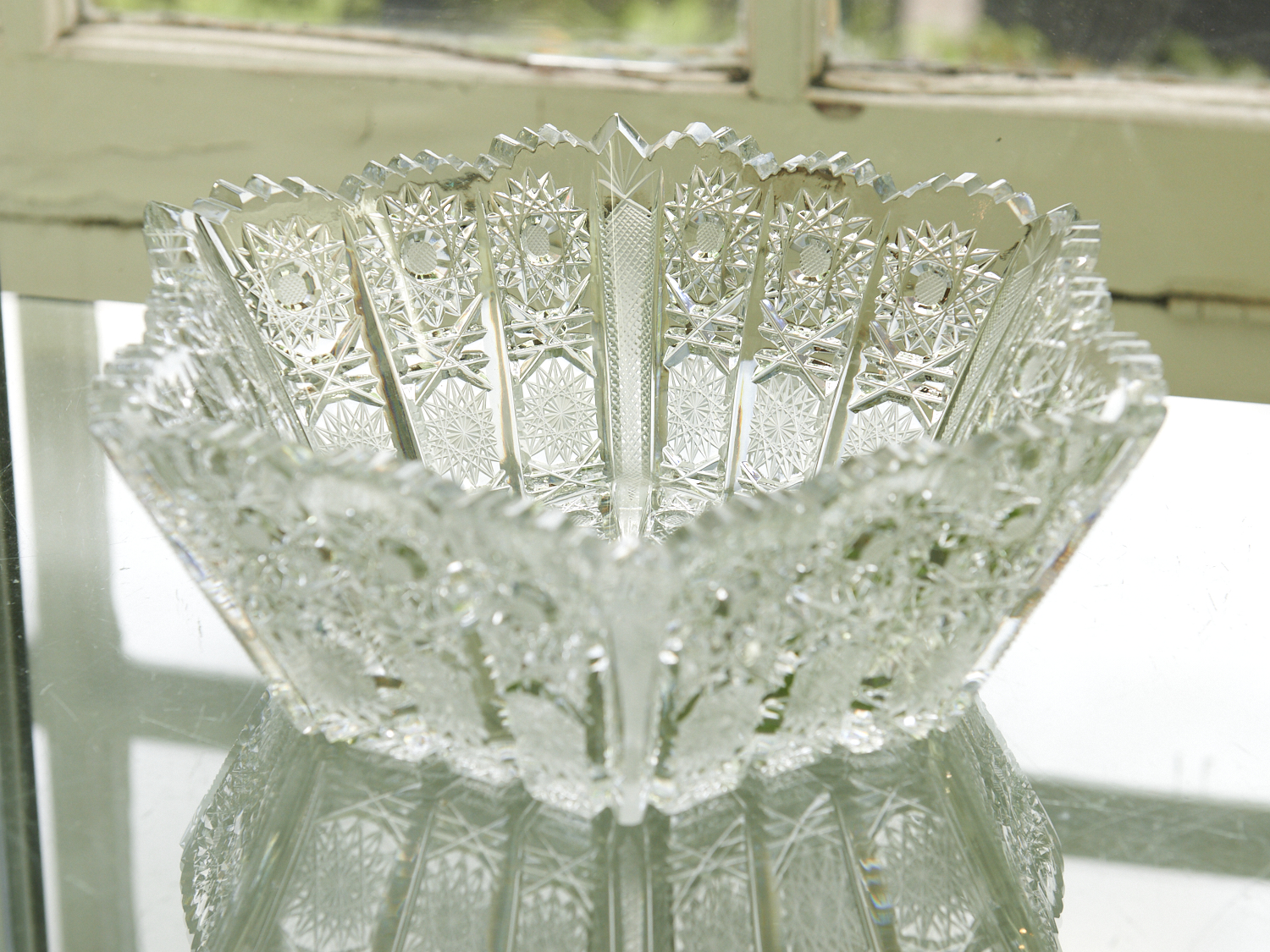 A HEAVILY CUT HEXAGONAL CYSTAL BOWL W.28CM, LEONARD JOEL LOCAL DELIVERY: SMALL