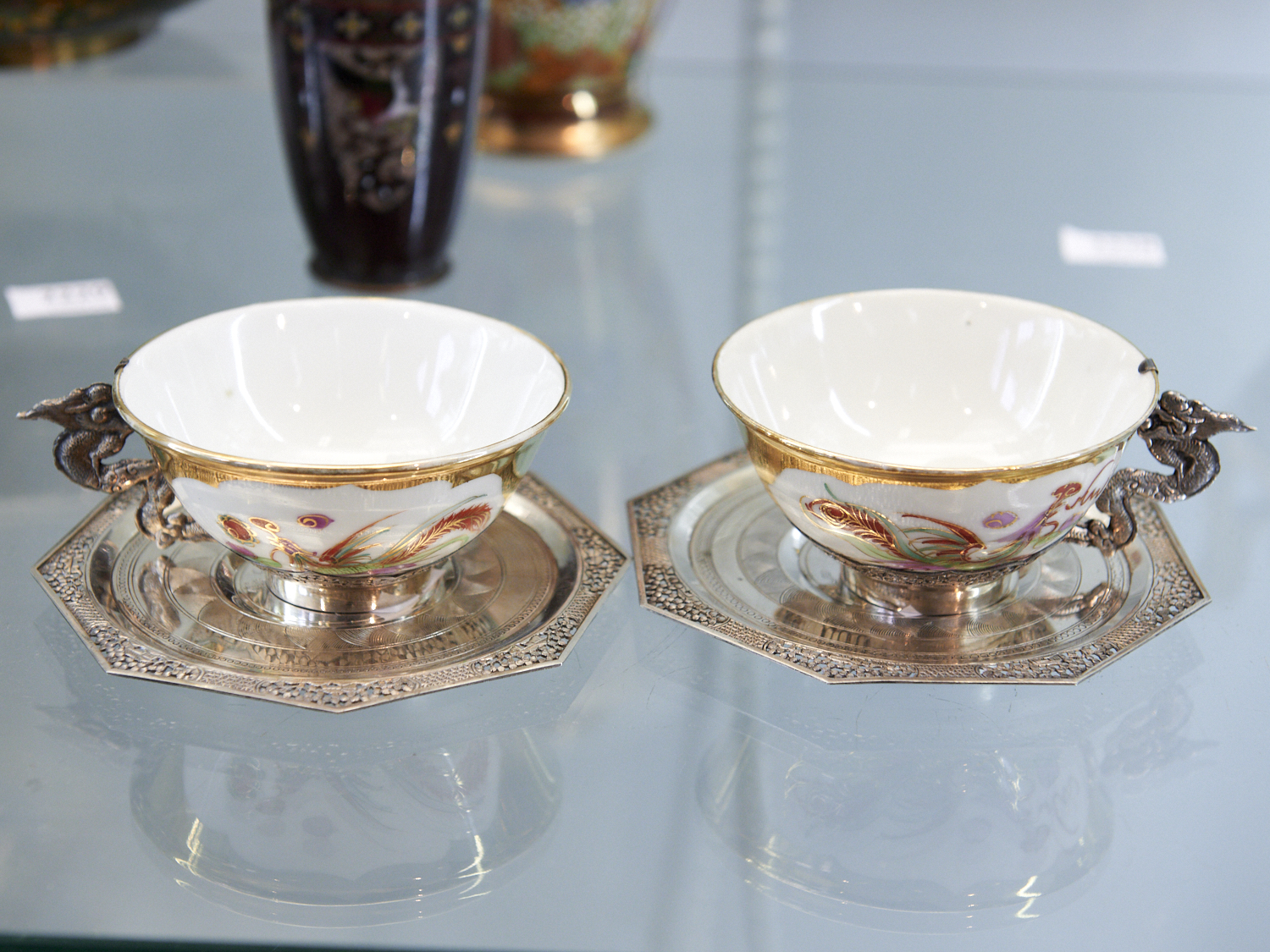 A PAIR OF CHINESE PORCELAIN 900 VIETNAMESE SILVER MOUNTED TEACUPS AND SAUCERS W.11.5CM (SAUCERS), LEONARD JOEL LOCAL DELIVERY: SMALL