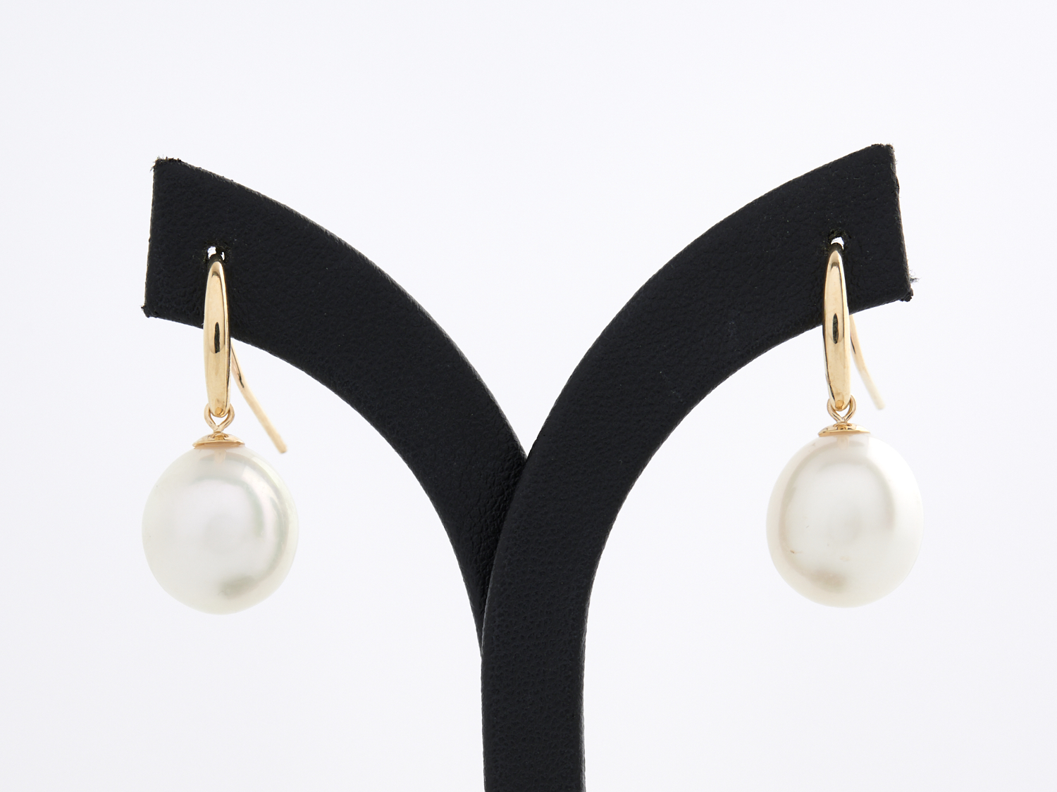 A PAIR OF WHITE SOUTH SEA PEARL EARRINGS TO SHEPARD HOOKS IN 9CT GOLD, THE PEARLS MEASURING 11.9MM