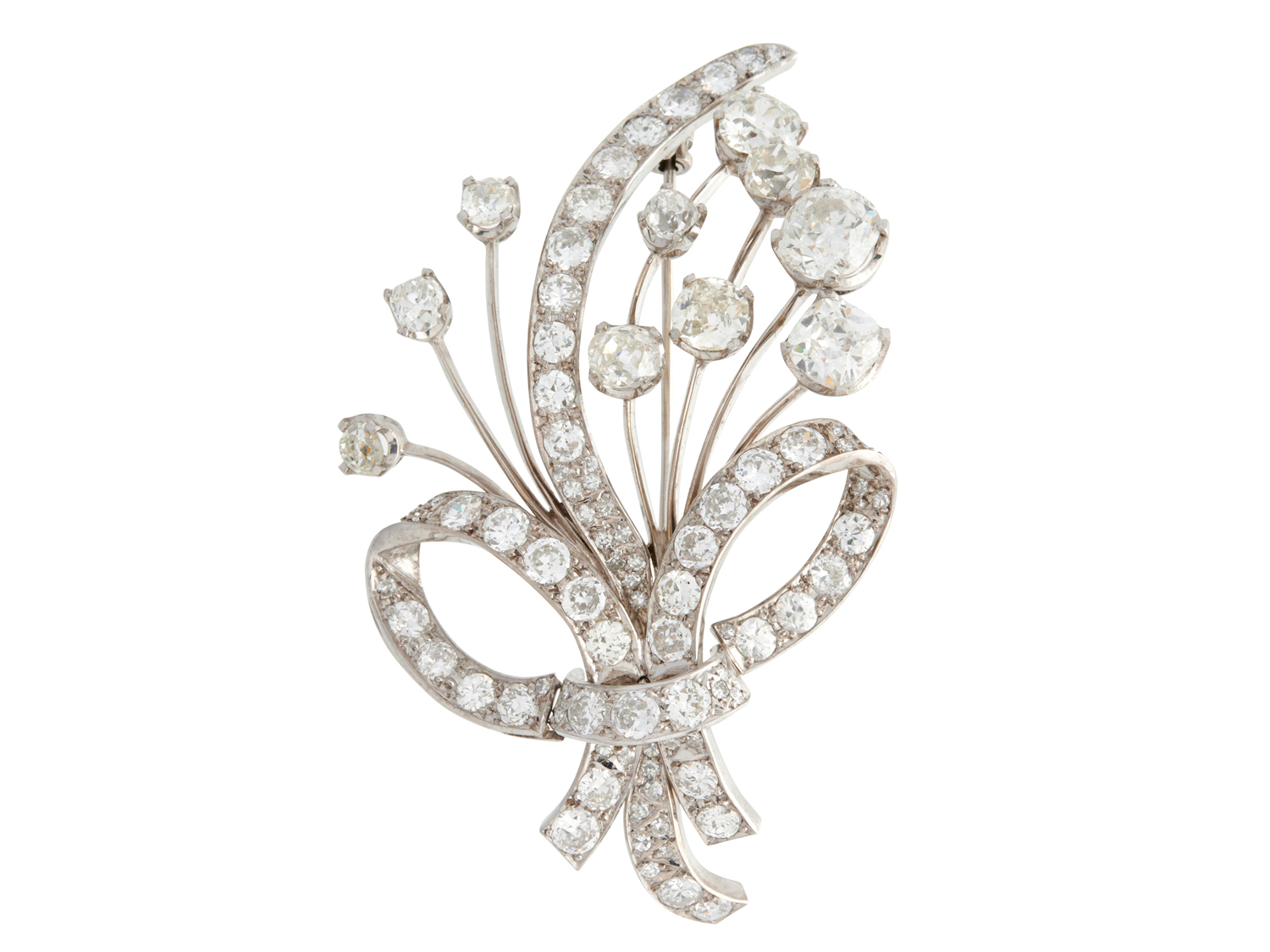Of spray bouquet design, claw-set with ten old European and old-cushion-cut diamonds, the centre stem and ribbon set throughout with brilliant and single-cut diamonds, the diamonds together weighing approximately 13.50 carats, length 65mm, width 40mm, gross weight approximately 23.0 grams.
