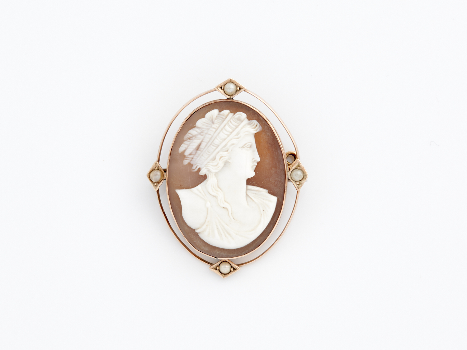 A CAMEO AND SEED PEARL BROOCH IN 9CT GOLD, 37MM X 30MM