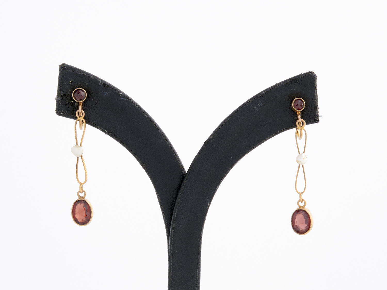 A PAIR OF GARNET AND SEED PEARL EARRINGS IN 9CT GOLD, TO SCREWBACK FITTINGS, LENGTH 30MM