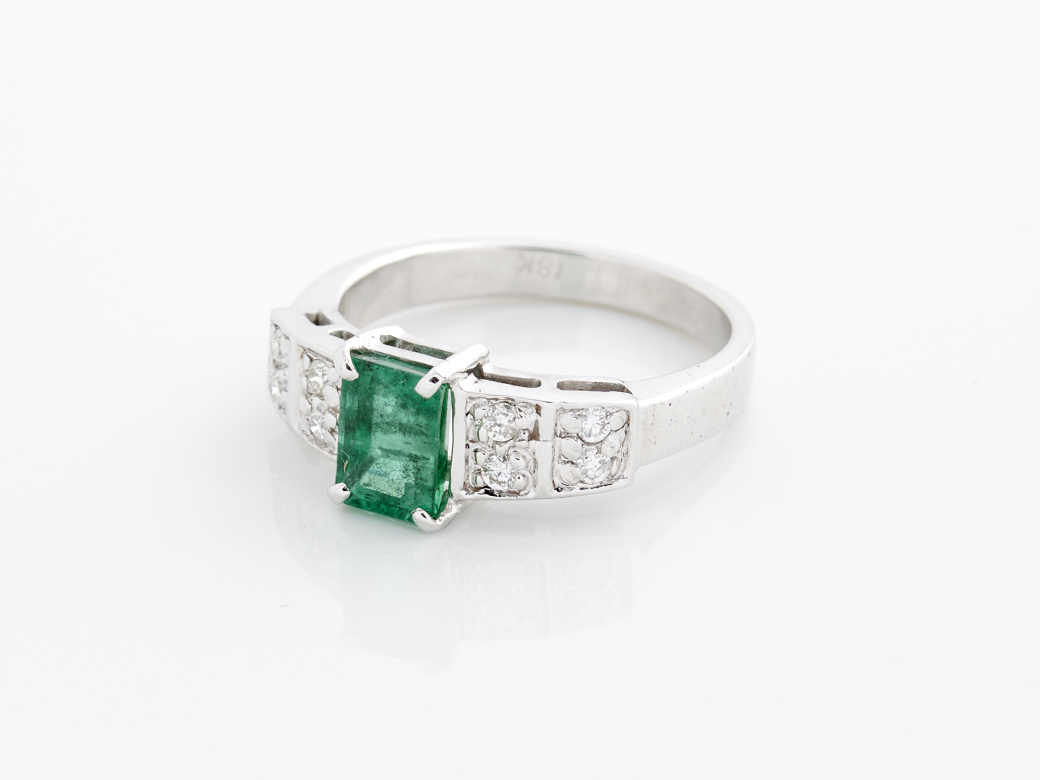 AN EMERALD AND DIAMOND RING IN 18CT WHITE GOLD, THE EMERALD WEIGHING 1.23CTS, THE DIAMONDS TOTALLING 0.22CTS, RING SIZE O, ACCOMPANIED BY A VALUATION