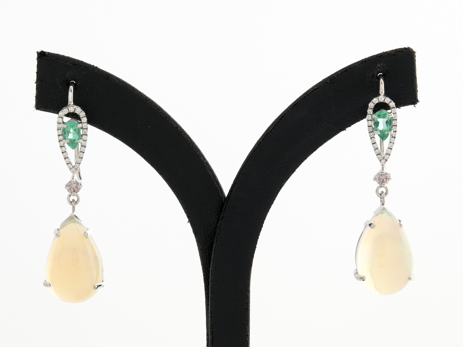 A PAIR OF OPAL, EMERALD, PINK DIAMOND AND DIAMOND EARRINGS IN 18CT WHITE GOLD TO SHEPHERD HOOK FITTINGS, THE OPAL WEIGHING 9.34CTS, WITH EMERALDS TOTALLING 0.60CTS, PINK DIAMONDS TOTALLING 0.165CTS AND DIAMONDS TOTALLING 0.15CTS, DROP LENGTH 43MM