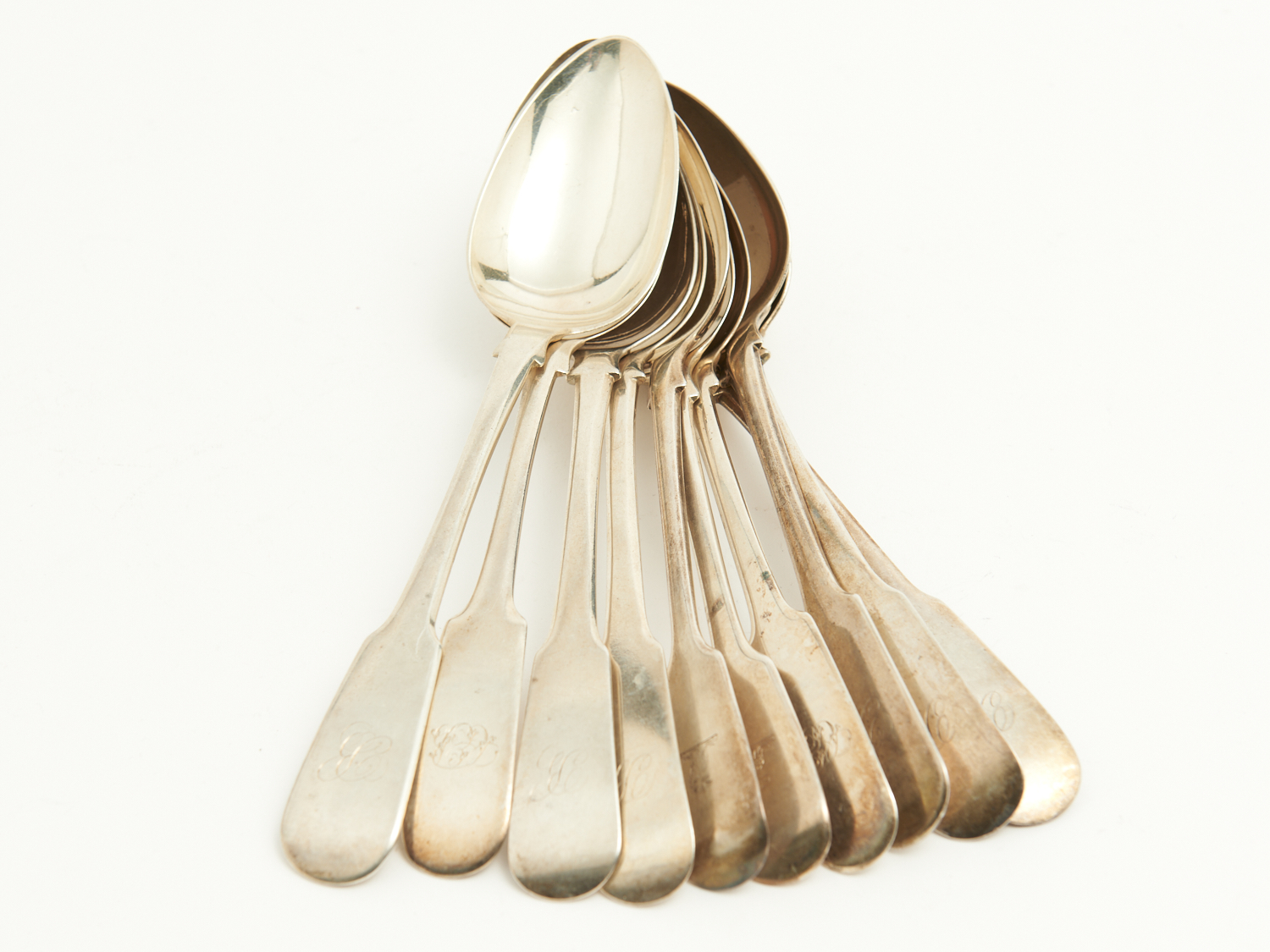 A MATCHED SET OF EIGHT GEORGE III AND VICTORIAN STERLING SILVER FIDDLE PATTERN TABLE SPOONS L.23CM 674G, LEONARD JOEL DELIVERY SIZE: SMALL