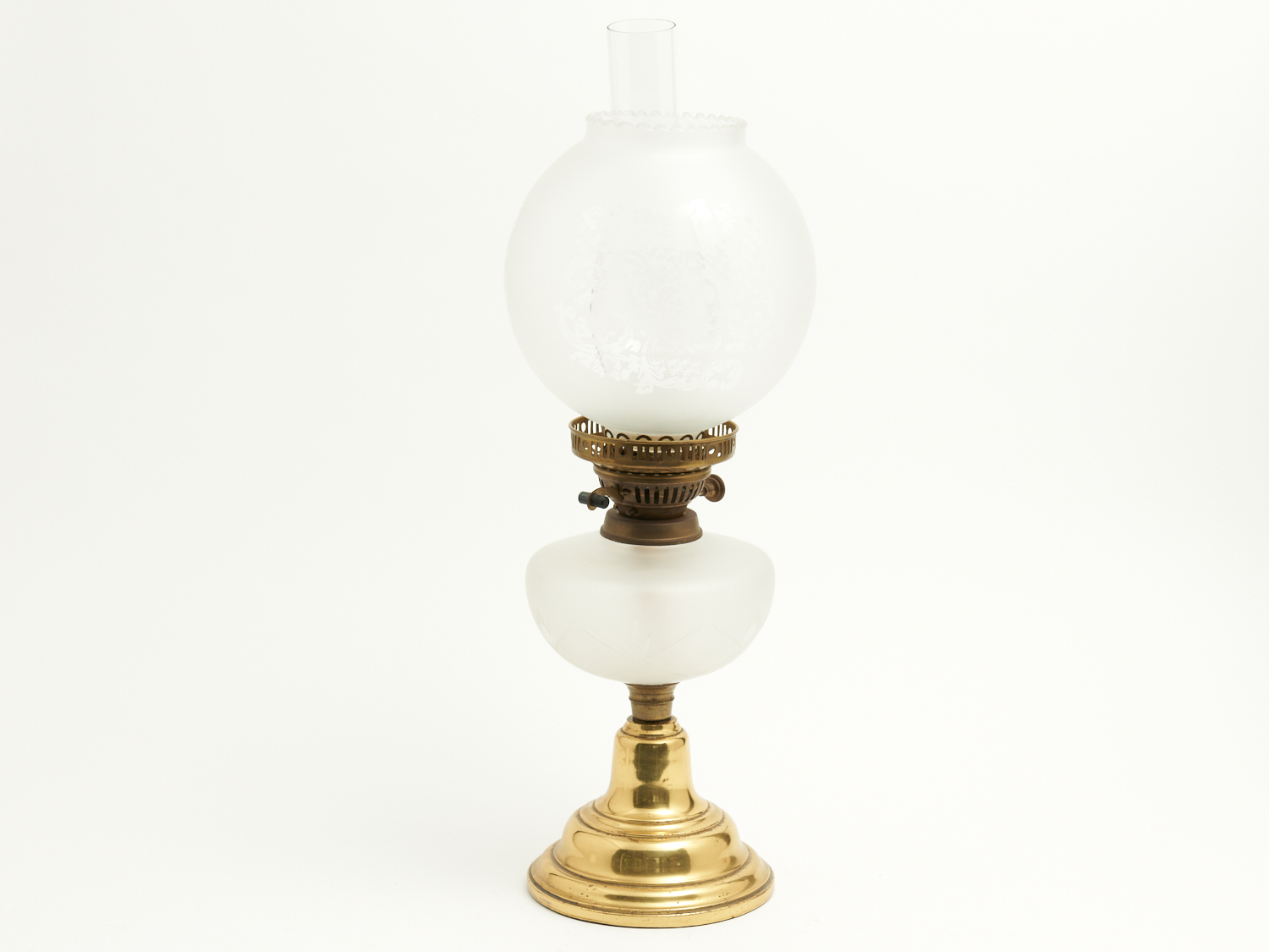 A BRASS AND ETCHED GLASS OIL LAMP H.55CM, LEONARD JOEL LOCAL DELIVERY: MEDIUM