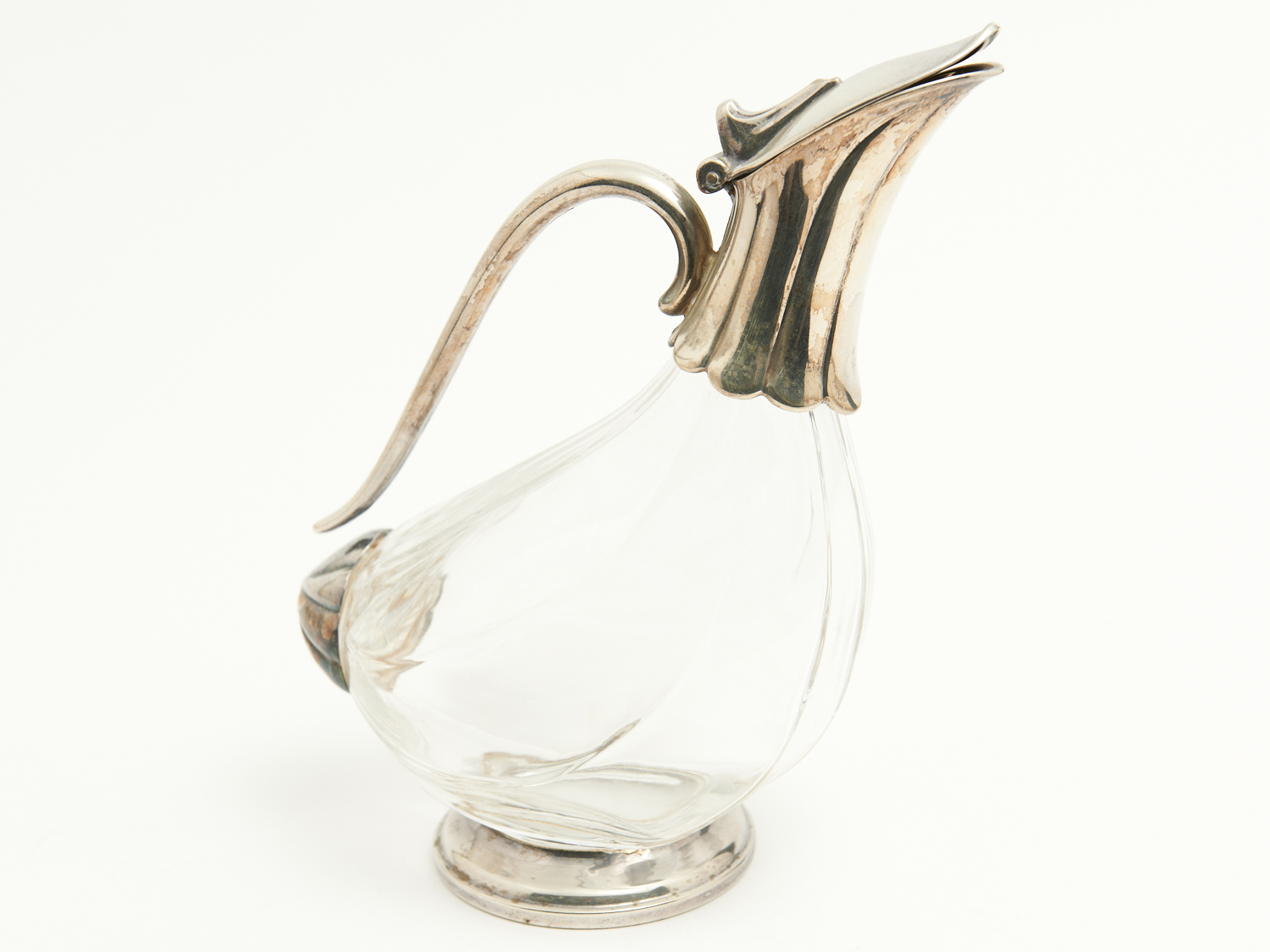 A PAIR OF SILVER PLATE-MOUNTED CRYSTAL WINE JUGS OF STYLISED DUCK FORM H.24.5CM, LEONARDJOEL LOCAL DELIVERY: SMALL