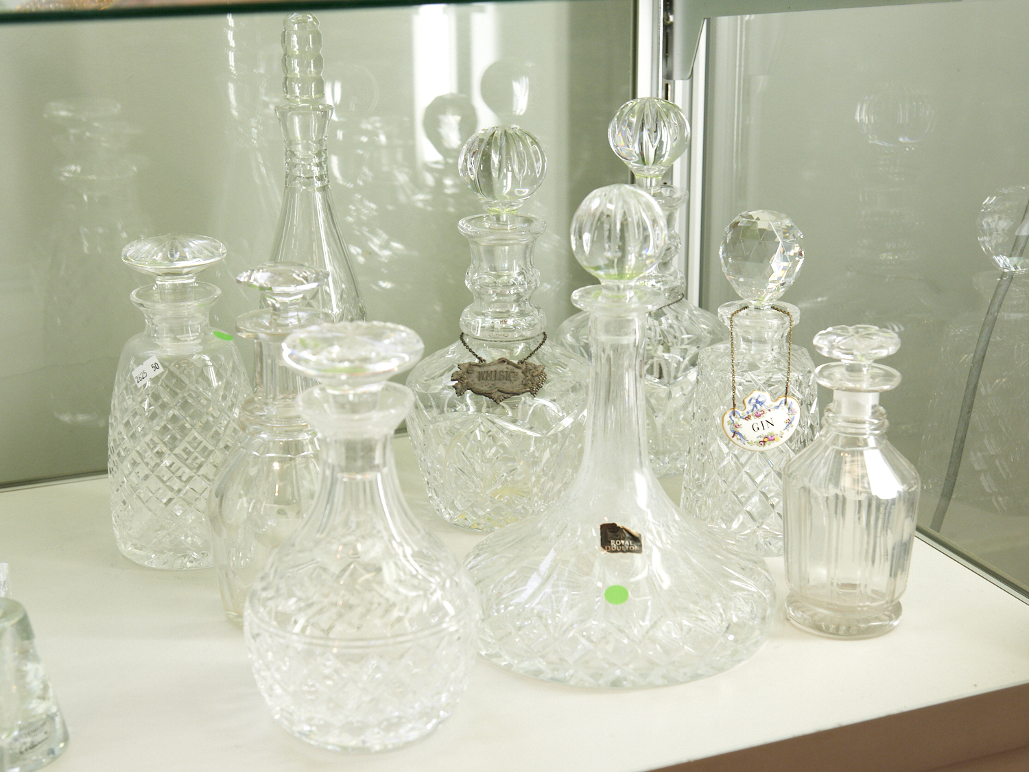 A GROUP OF NINE CRYSTAL DECANTERS INCLUDING ROYAL DOULTON (A/F TO SOME STOPPERS) H.35.5CM (TALLEST), LEONARD JOEL LOCAL DELIVERY: MEDIUM