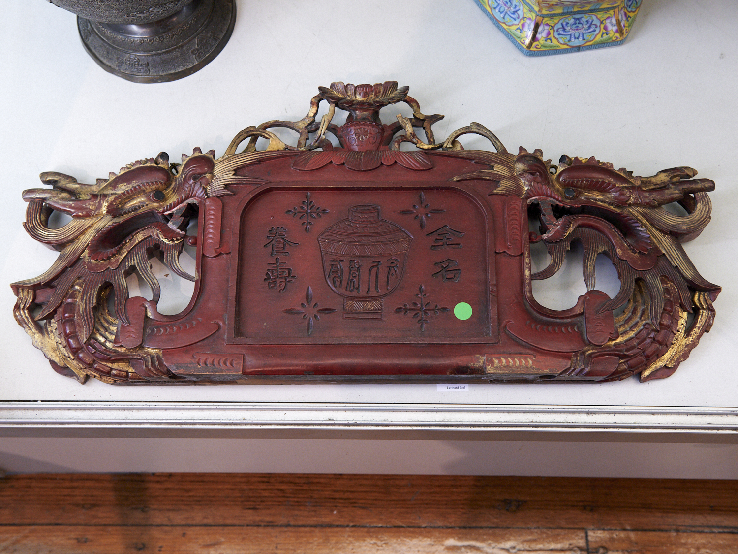 A CHINESE CARVED AND LACQUERED INSCRIBED PLAQUE (A/F) W.55CM, LEONARD JOEL LOCAL DELIVERY: SMALL
