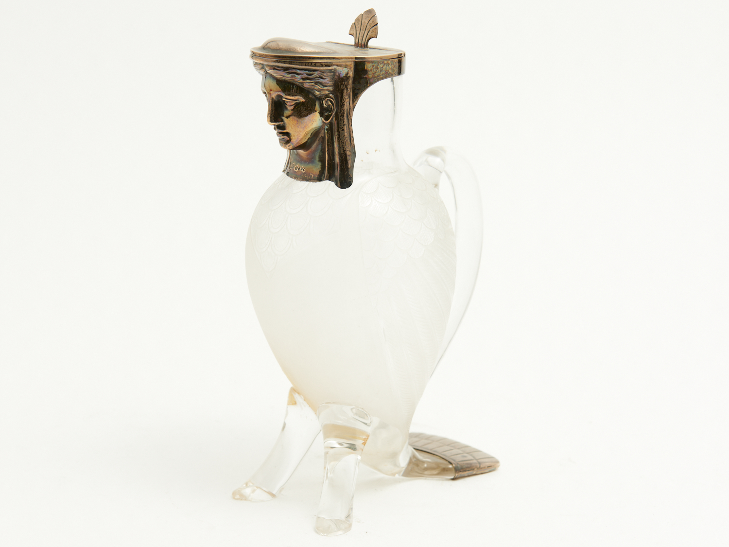 A VICTORIAN STERLING SILVER MOUNTED ETCHED GLASS CLARET JUG IN THE STYLISED FORM OF A HARPY, THE SILVER MOUNTS BY ALEXANDER CRICHTON, LONDON, 1882 (REPAIRS AND LOSSES TO ONE FOOT OF THE JUG) H.26CM, LEONARD JOEL LOCAL DELIVERY: SMALL