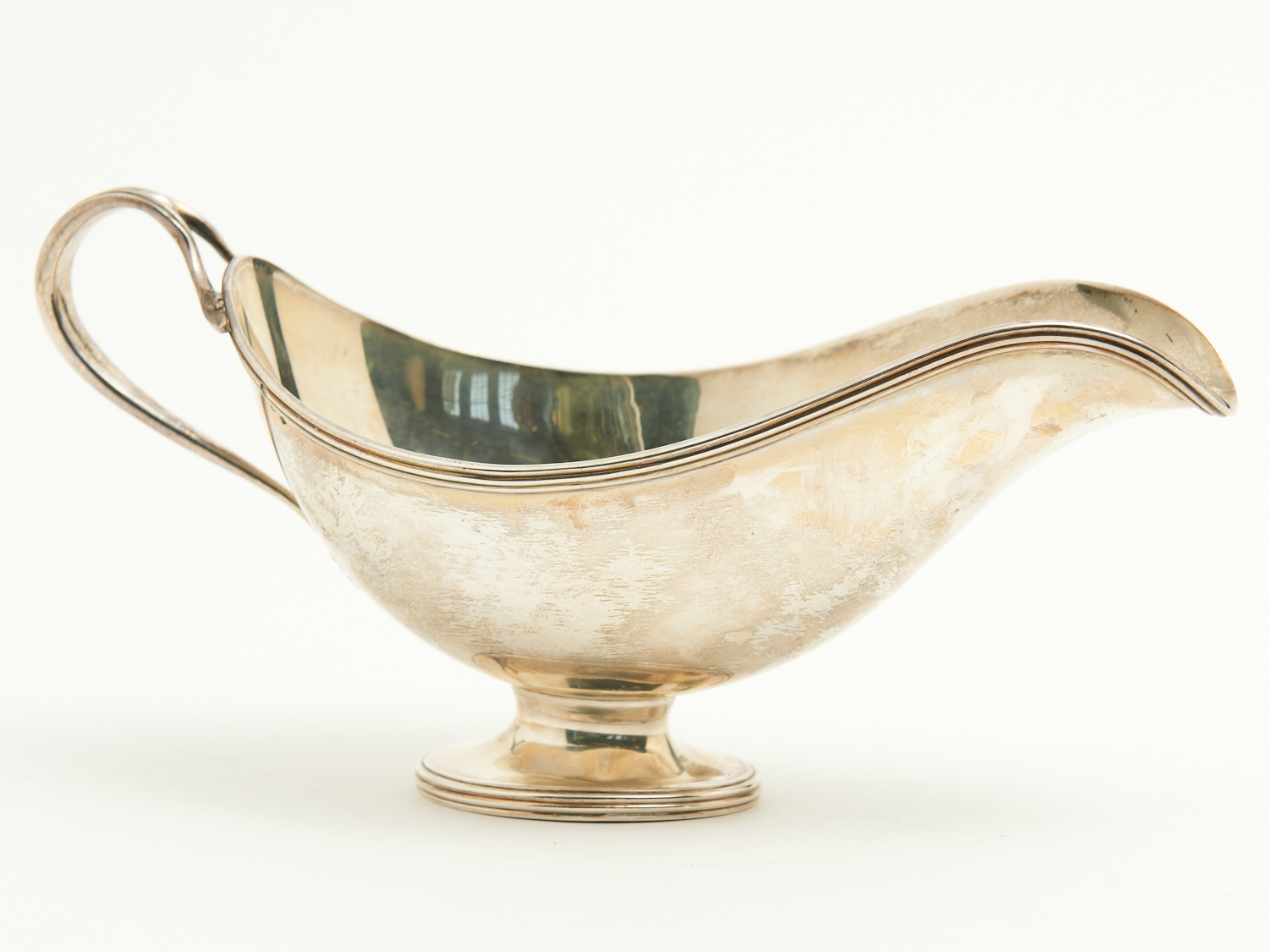 A POSSIBLY LATE GEORGE III STERLING SILVER SAUCE BOAT (MARKS INDISTINCT) L.25CM 300G, LEONARD JOEL LOCAL DELIVERY: SMALL