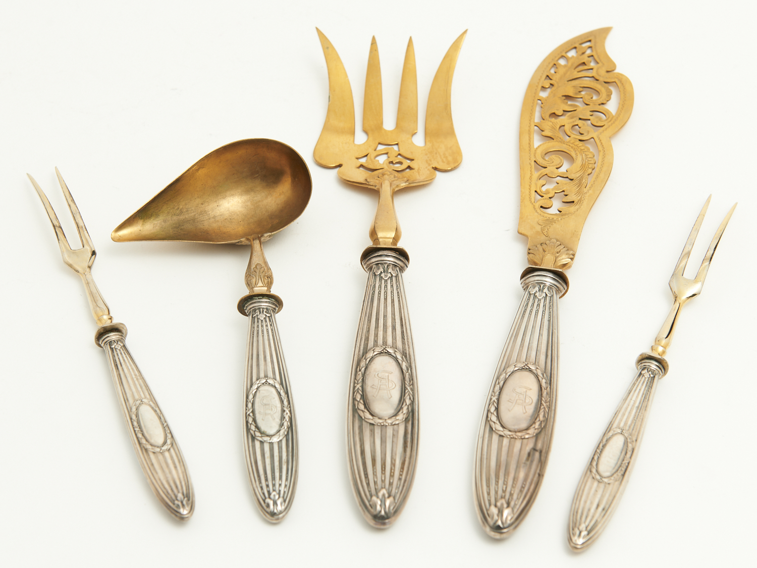 A FIVE PIECE 800 SILVER HANDLED AND SILVER GILT SERVING SET COMPRISING A PIERCED FISH KNIFE AND FORK, SAUCE LADLE AND TWO FORKS L.30.5CM (LONGEST), LEONARD JOEL LOCAL DELIVERY: SMALL