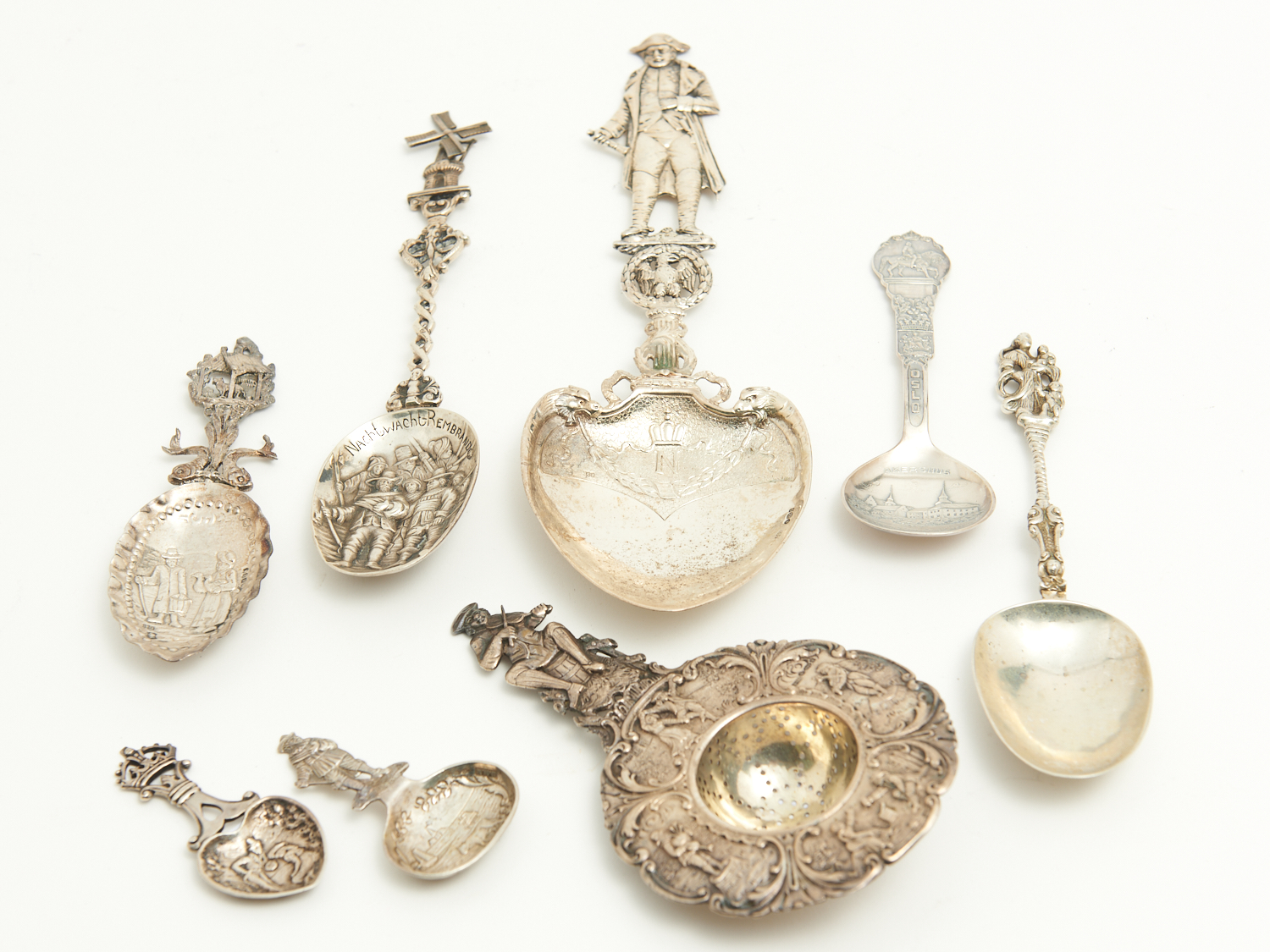 EIGHT CONTINENTAL SILVER SPOONS INCLUDING A SIFTER OF VARIOUS SILVER FINENESS L.26CM (LONGEST) 424G, LEONARD JOEL LOCAL DELIVERY: SMALL