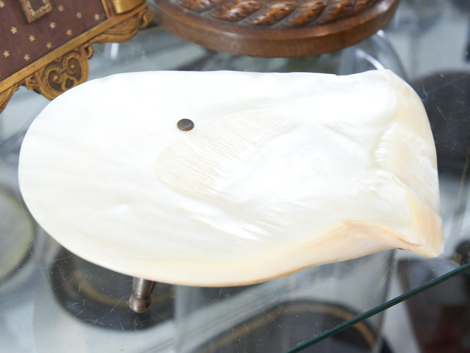 A MOTHER-OF-PEARL DISH RAISED ON THREE BRASS FEET L.27CM, LEONARD JOEL LOCAL DELIVERY: SMALL
