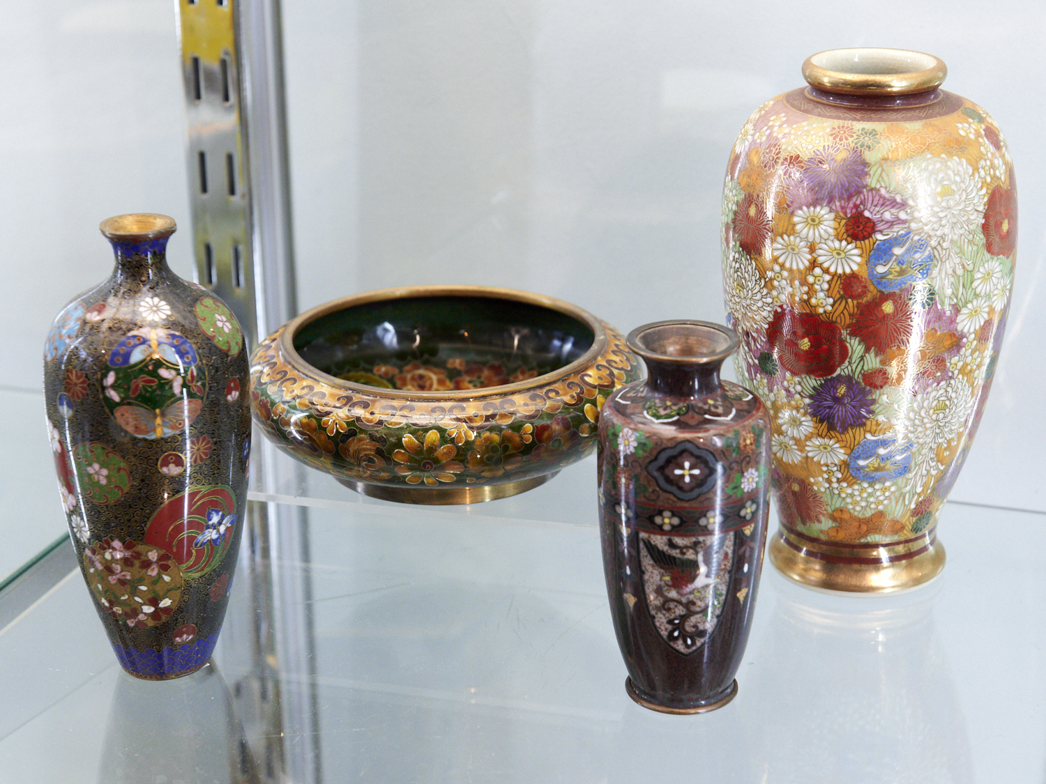 TWO CLOISONNE VASES AND A BOWL TOGETHER WITH A POSSIBLY SATSUMA VASE H.19.5CM, LEONARD JOEL DELIVERY: SMALL
