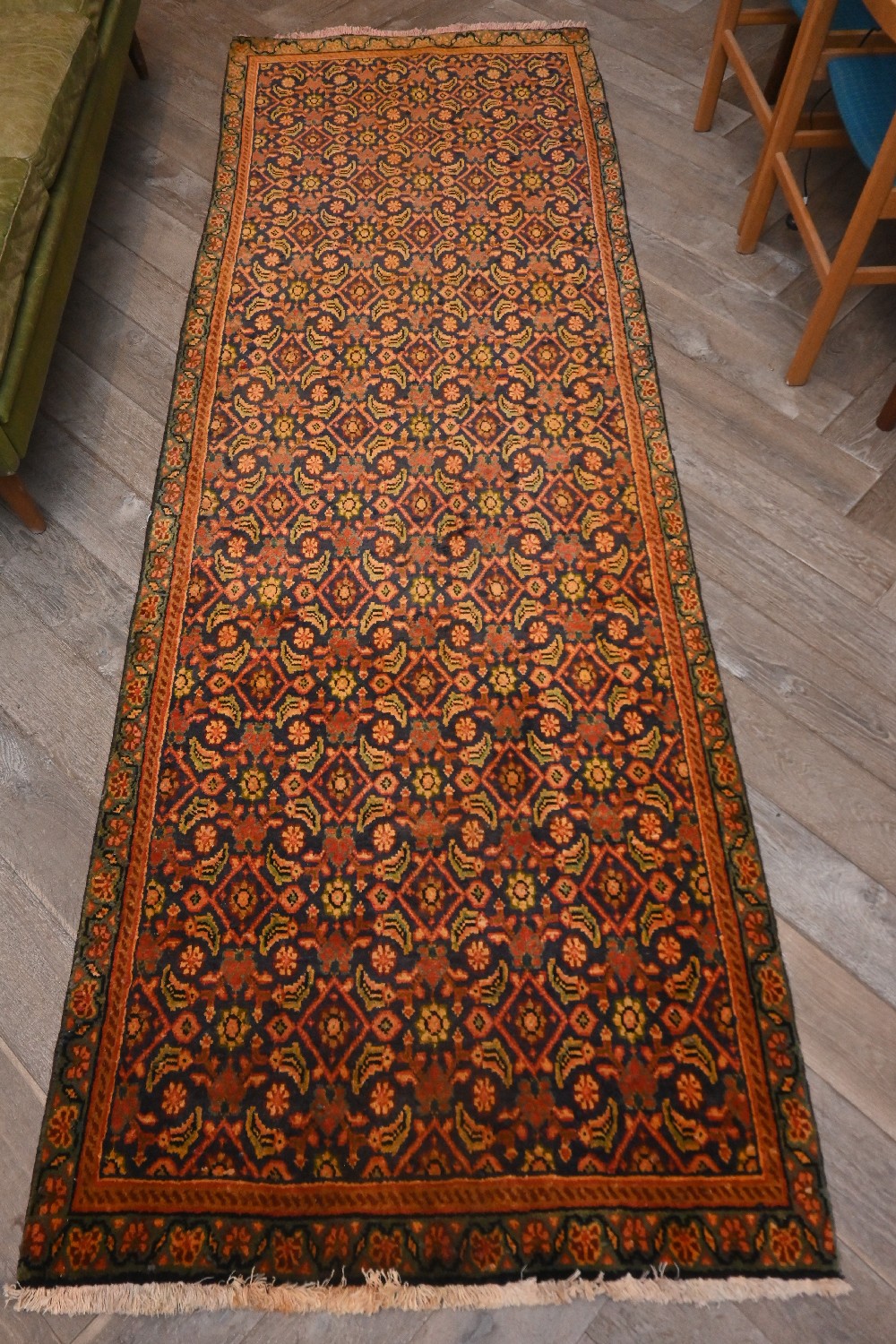 A SOLID PERSIAN MAHALAT HALL RUNNER. 100% HAND KNOTTED WOOLLEN PILE WITH A DEEP INDIGO BLUE GROUND IN HERATI MOTIFS ALL OVER CONTAINING TONES OF GOLD, CORRAL AND SAGE GREEN BORDER, A HARD-WEARING HALL RUNNER IN GREAT GALLERY CONDITION. SIZE: 299 X 103 CM ORIGIN: PERSIA – RRP: $1,600 DOCUMENTATION OF AUTHENTICITY INCLUDED.