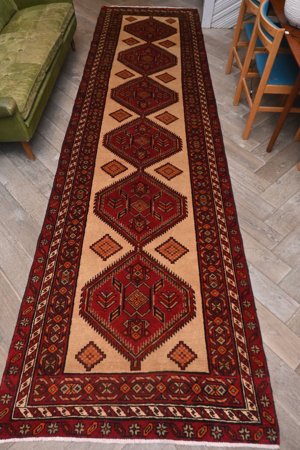 A PERSIAN SARAB HALL RUNNER WITH A GREAT 100% WOOLLEN HAND KNOTTED PILE WITH MULTIPLE DIAMOND SHAPE LINKED MEDALLIONS ALL OVER IN TONES OF DEEP RUBY RED ON A BEIGE TONED GROUND COLOUR. A VERY HARD-WEARING EXAMPLE. EX-GALLERY DISPLAY PIECE. SIZE: 437 X 118 CM ORIGIN: PERSIA - RRP: $2,800 DOCUMENTION OF AUTHENTICITY INCLUDED