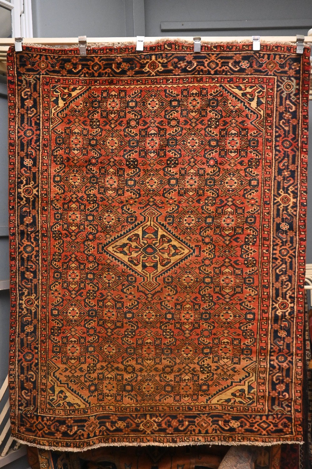 PERSIAN HOSSEIN ABAD SEMI TRIBAL RUG WITH HERATI MOTIS, 100% HAND KNOTTED SEMI VINTAGE WOOLLEN PILE WITH NATURAL DYES INCLIDING ABRASHED EFFECT THROUGHOUT IN TONES OF SUBTLE RED WITH BLUE AND GREEN HIGHLITES. SIZE: 200 X 150 CM – RRP: $1400 ORIGIN: PERSIA DOCUMENTAION OF AUTHENTICITY INCLUDED.