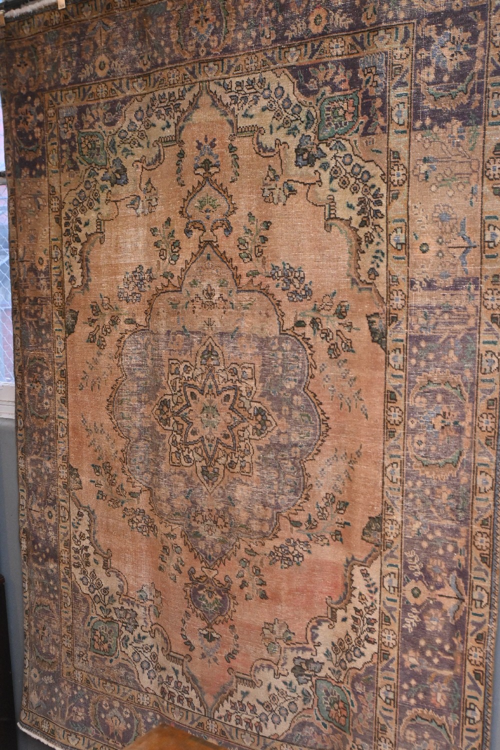 A MODERN PERSIAN VINTAGE OVERDYE TABRIZ CARPETIN MOST DECORATIVE MELLOW TONES, HAND KNOTTED WITH 100% WOOLLEN VINTAGE PILE IN TONE SOF CORRAL FIELD, EMERALD GREEN HIGHLIGHTS AND CHAMPAIGN. GALLERY DISPLAYED RUG. SIZE: 282 X 191 CM ORIGIN: PERSIA. RRP- $3,200 DOCUMENTATION OF AUTHENTICITY INCLUDED.