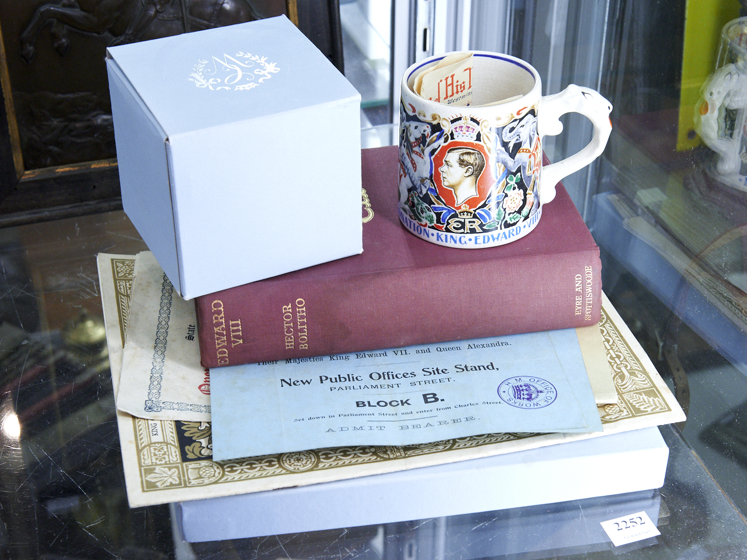 A COLLECTION OF CORONATION MEMORABILIA INCLUDING A CORONATION CUP, TWO TICKETS FOR THE CORONATION OF KING EDWARD VII AND A COMMERATIVE PLATE AND CUP FOR THE MARRIAGE OF PRINCE WILLIAM OF WALES AND CATHERINE MIDDLETON DIA.22CM (PLATE), LEONARD JOEL DELIVERY SIZE: SMALL