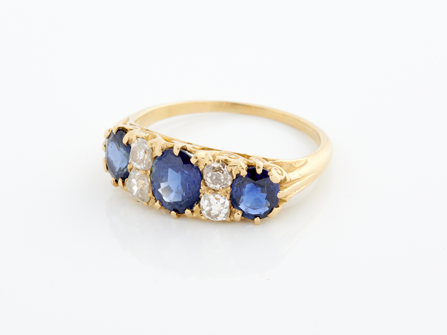 AN ANTIQUE SAPPHIRE AND DIAMOND RING IN 18CT GOLD, THE SAPPHIRES TOTALLING APPROXIMATELY 2.20CTS, DIAMONDS TOTALLING 0.36CTS, SIZE S, WEIGHT 5.1GMS