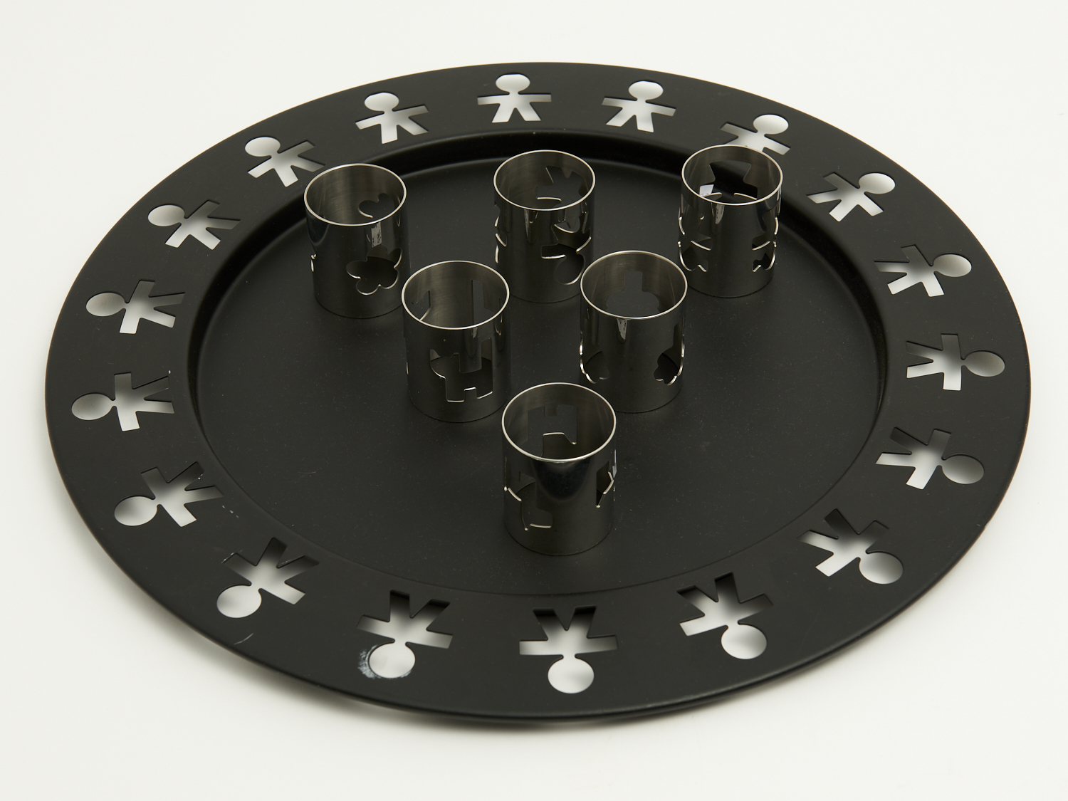 AN ALESSI GIROTONDO PLATTER WITH SIX STAINLESS STEEL NAPKIN HOLDERS DIA.40CM (PLATTER), LEONARD JOEL DELIVERY SIZE: SMALL