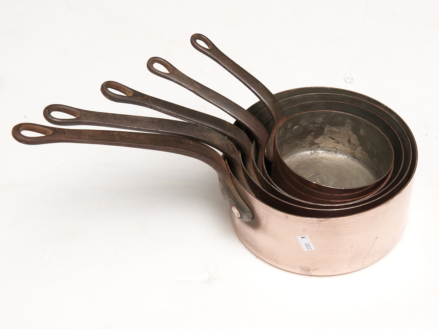 A SET OF FIVE GRADUATED COPPER SAUCEPANS DIA.21CM, LEONARD JOEL LOCAL DELIVERY: SMALL