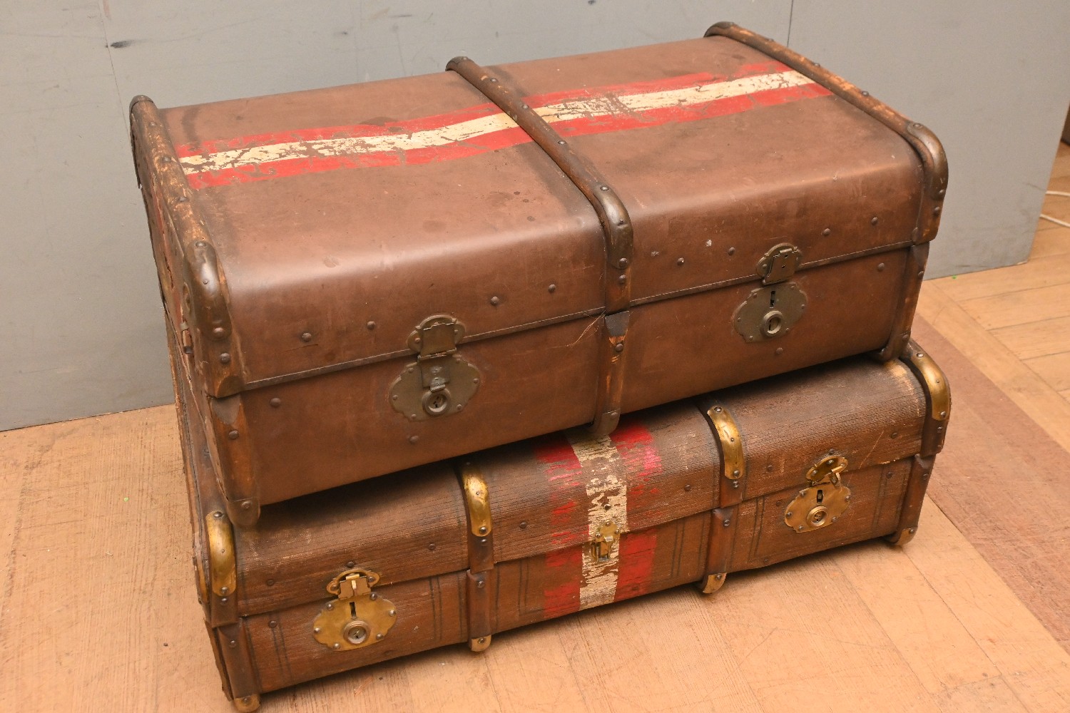 A PAIR OF BRASS BOUND TRAVELLING TRUNKS (34H X 100W X 61D CM) (LEONARD JOEL DELIVERY SIZE: X-LARGE)