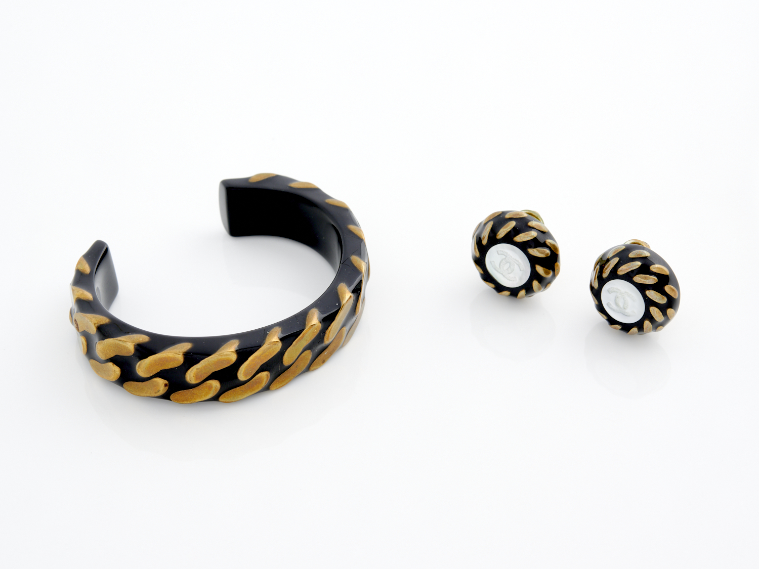CHANEL, A VINTAGE JEWELLERY SUITE, COMPRISING A PAIR OF EARRINGS AND BANGLE, EARRINGS TO CLIP ON FITTINGS, CIRCA 1997